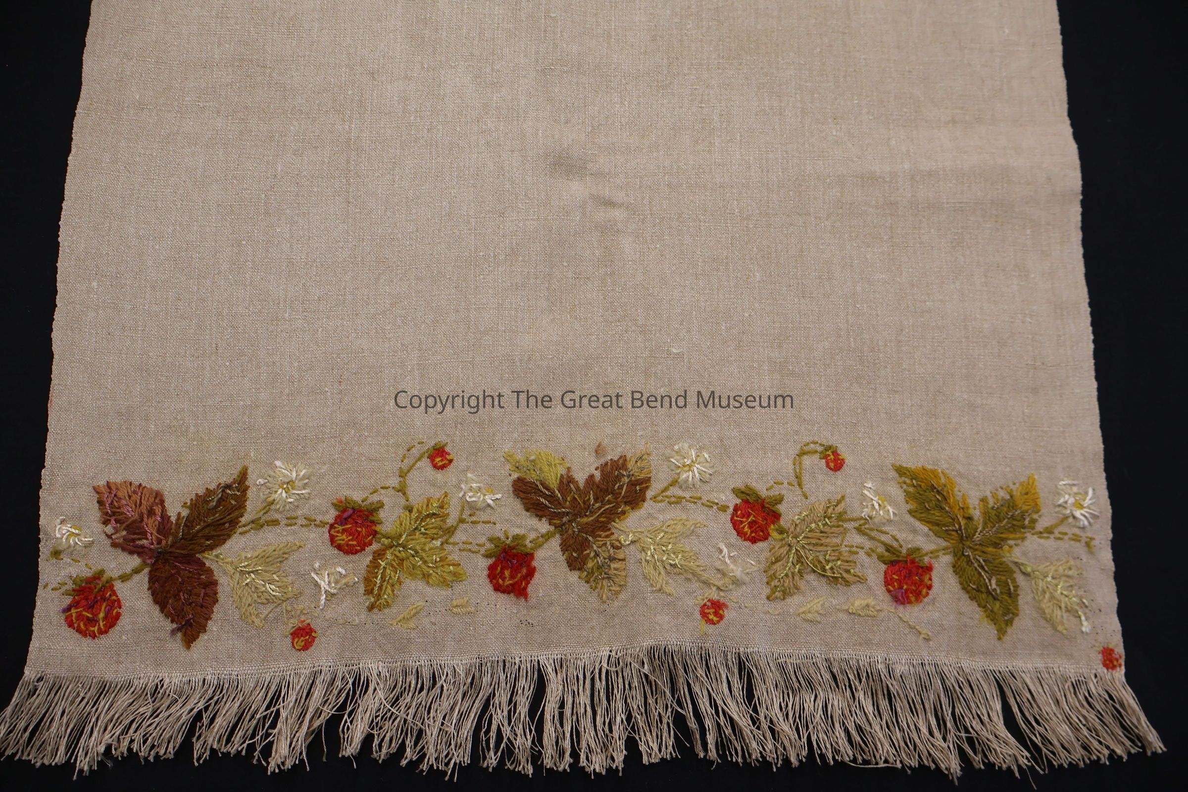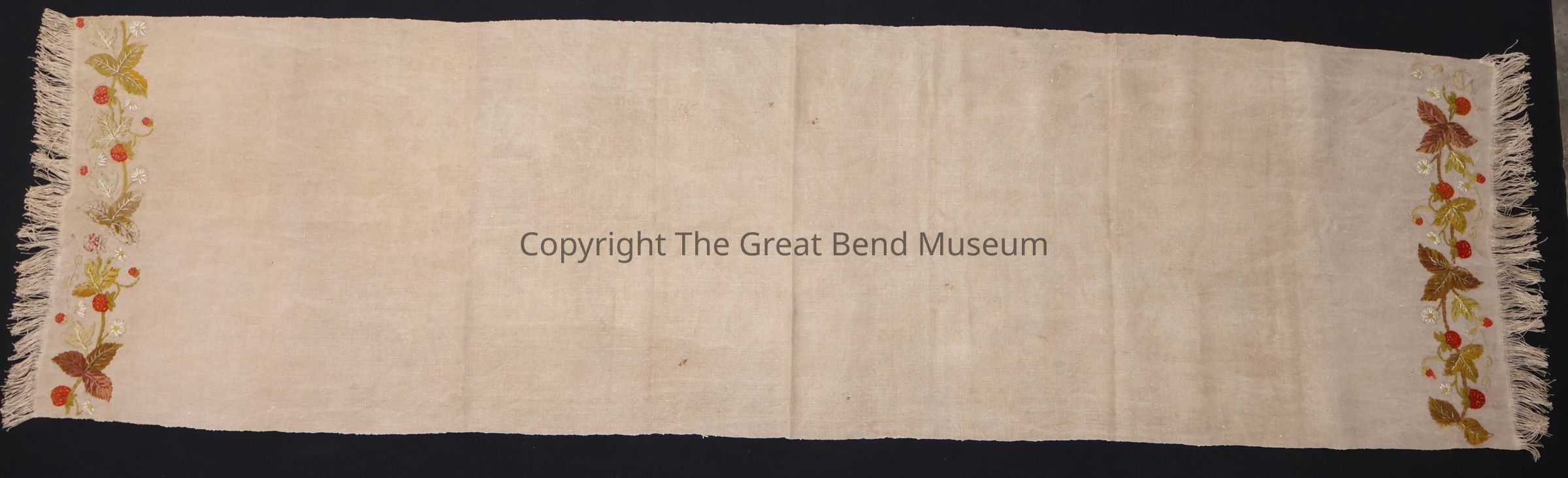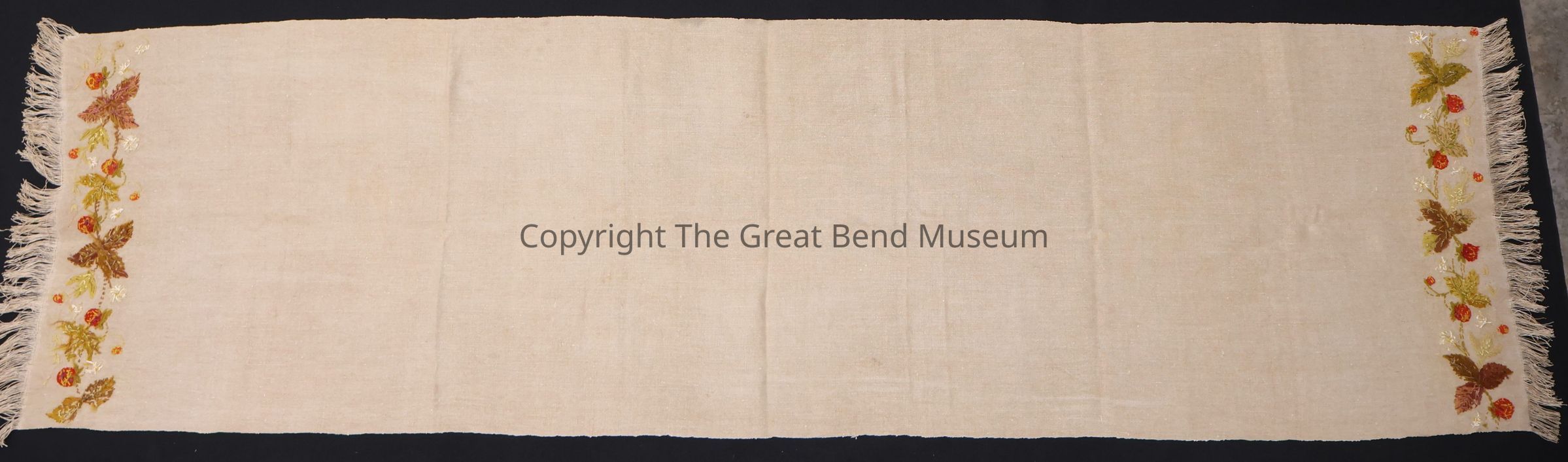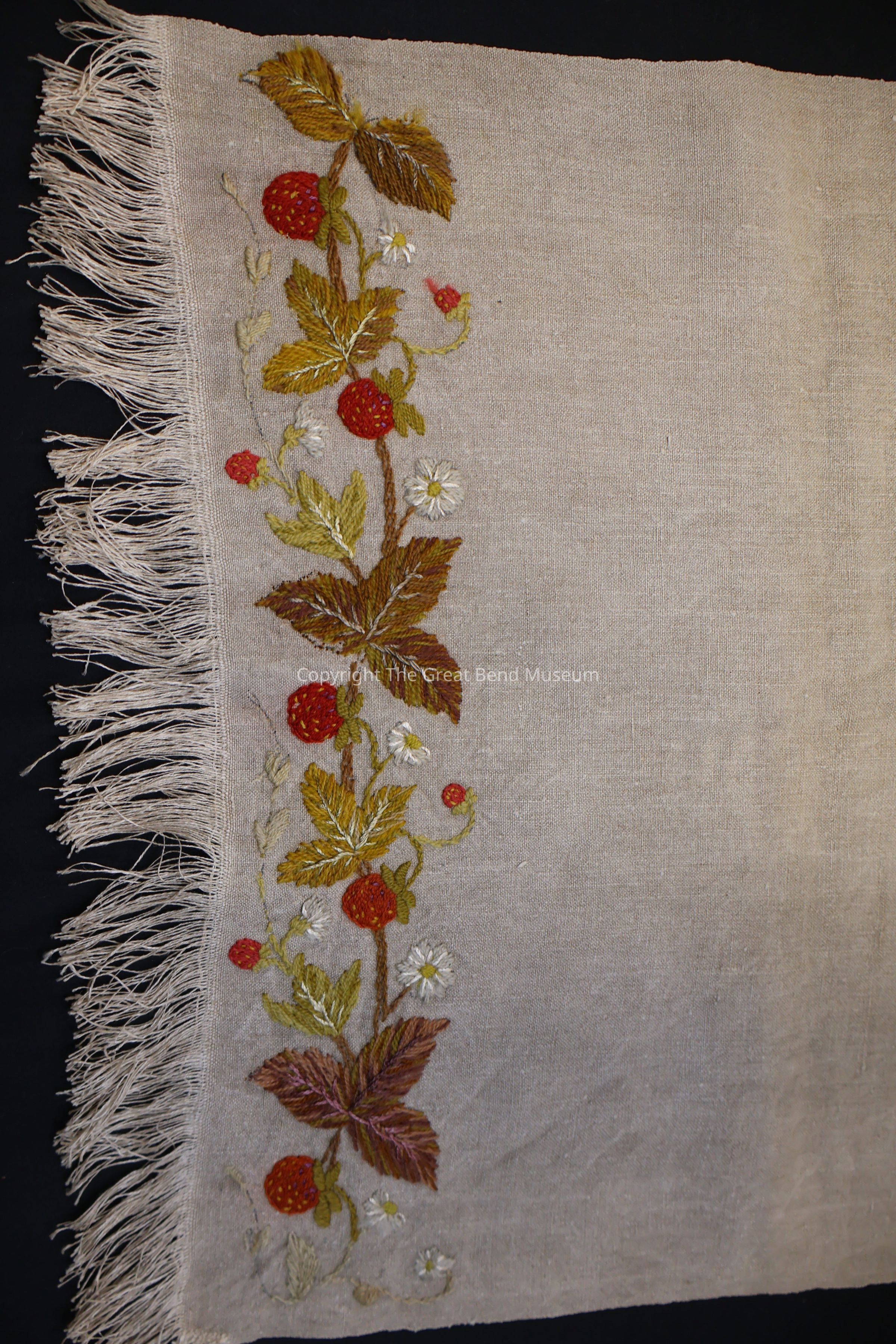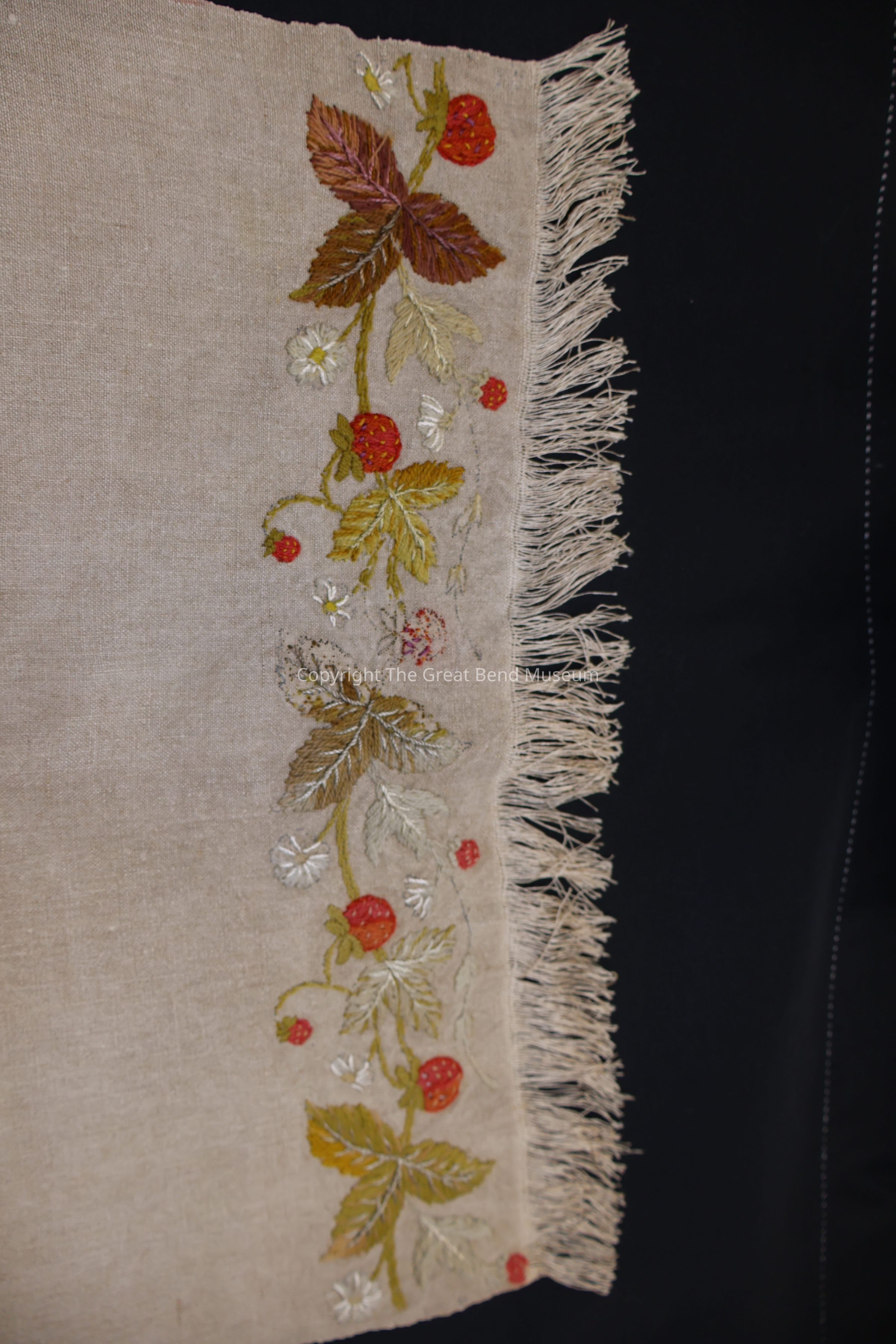 label: "Table scarf (tan linen embroidered with strawberries, daisies, brown leaves)"Acquisition