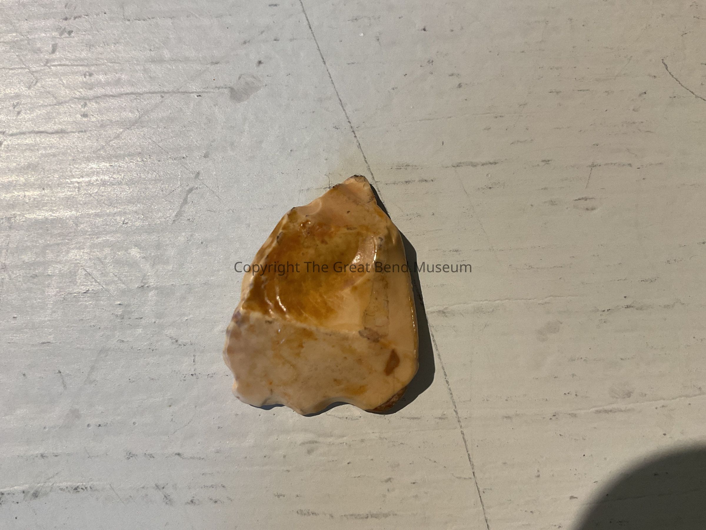 Small yellow Jasper piece.Leaf shaped with beveled base. Material is shiny and very smooth to the touch. Used for scraping hides,bones,or shell tools.Made/Created