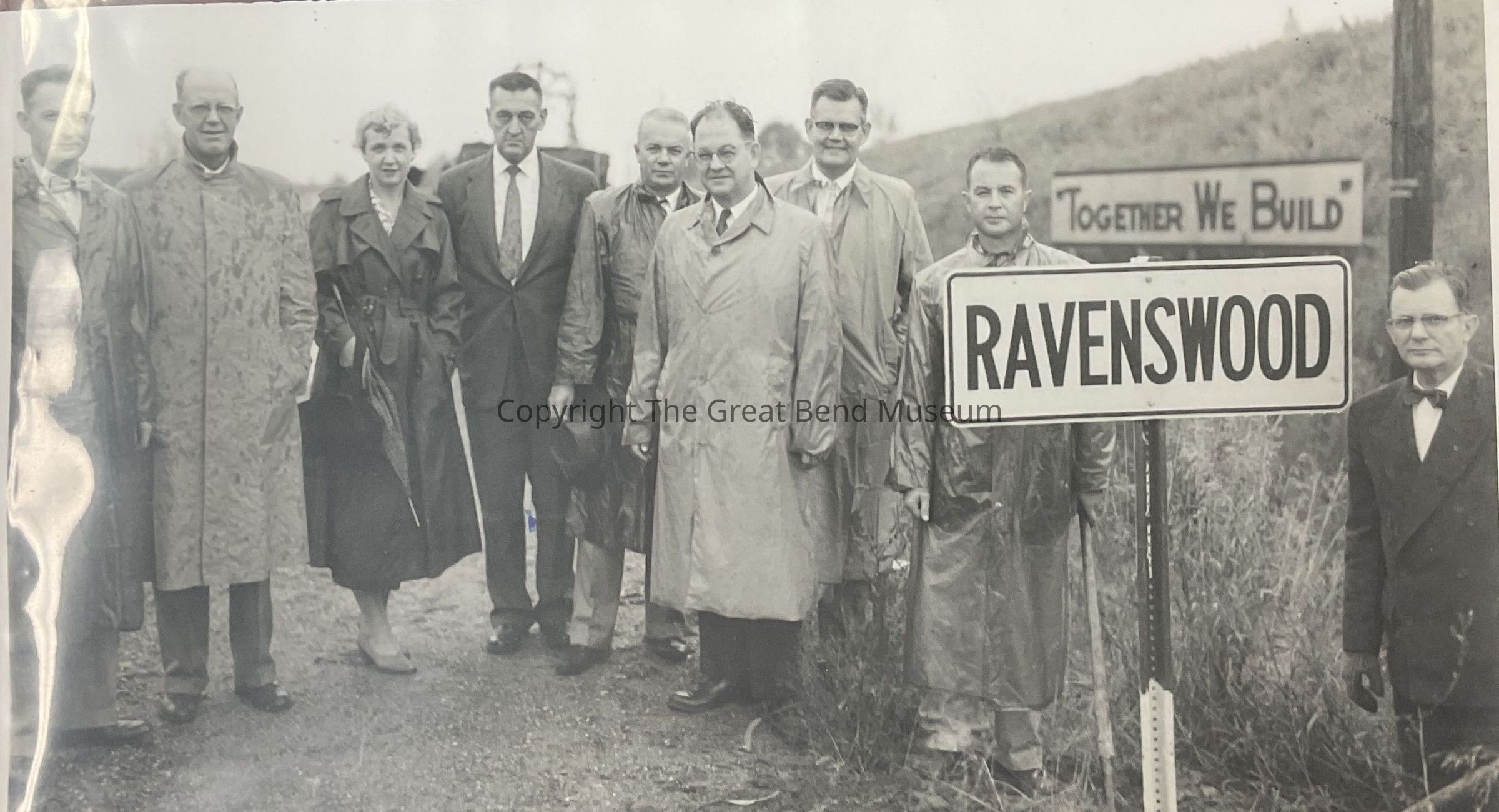 Business leaders standing close to Ravenswood sign along with one that says "Together We Build" stamp on back says Oct 10. 1955. 8 males and 1 female. All have overcoats on. One man in coveralls holding a shovel.