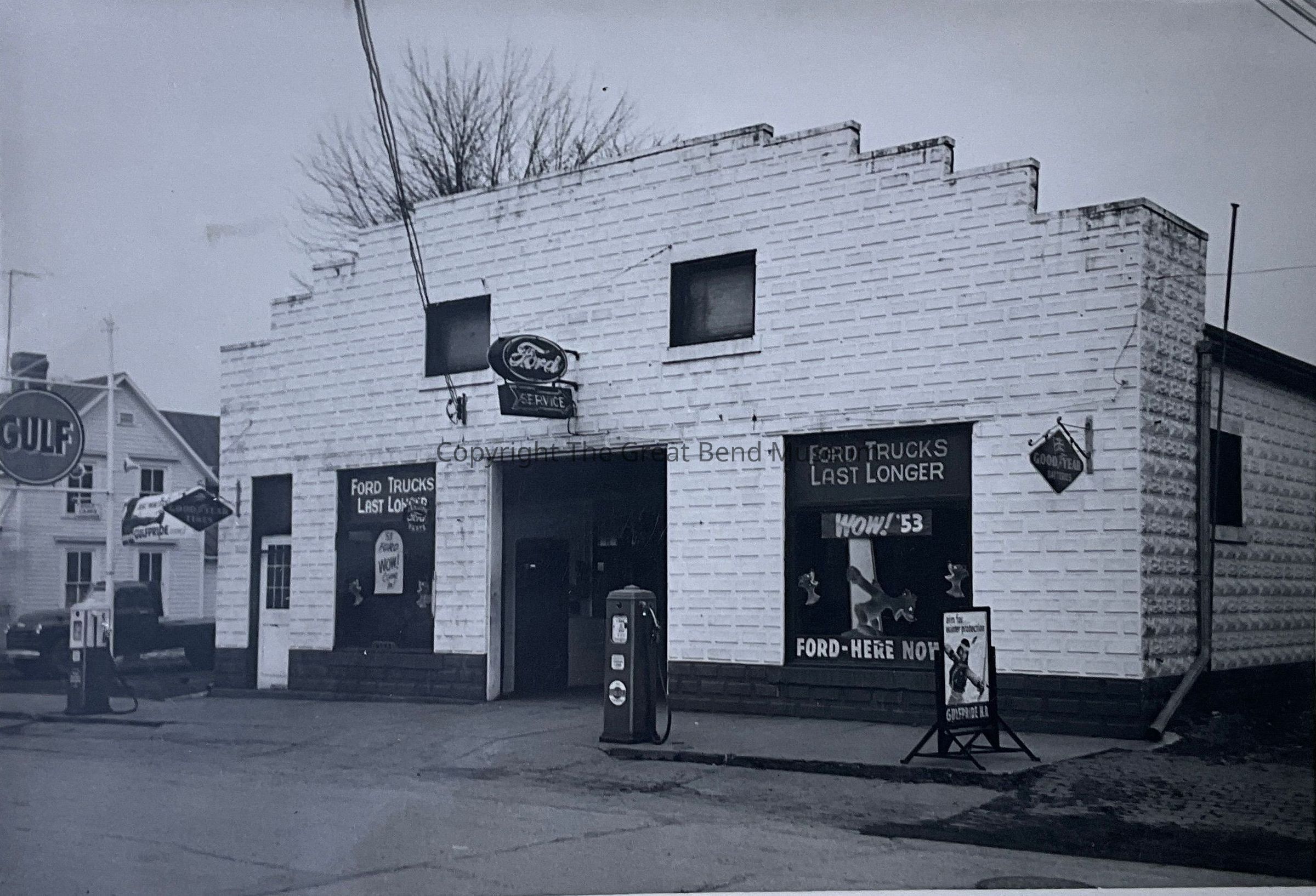 Photo of Ford Garage and Service Station. Building is white decorative brick. Large windows on either side of Bay Garage door. White man door on left of picture. 2 gas pumps in front, along with advertisement sign. Sign in window say's "Ford Trucks Last Longer". Large Ford logo sign in top middle of building has Goodyear tire sign upper right.Photograph Details