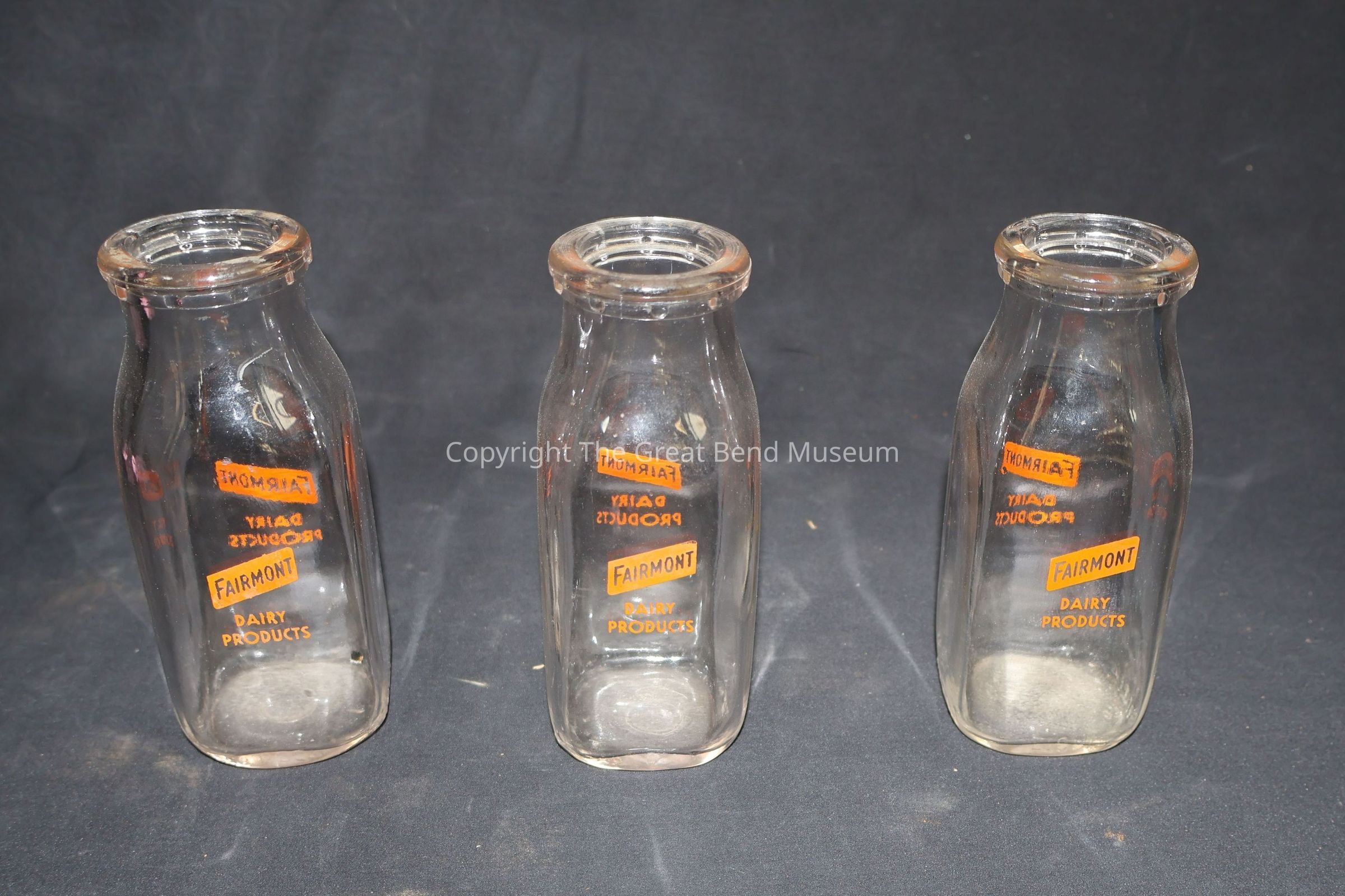 small clear glass, single serve glass milk bottle. Have squared body with "Fairmont Dairy Products" painted in red ink, has rounded lip. Has "Half Pint" embossed on side at the bottom. "Sealed" on other side.Acquisition