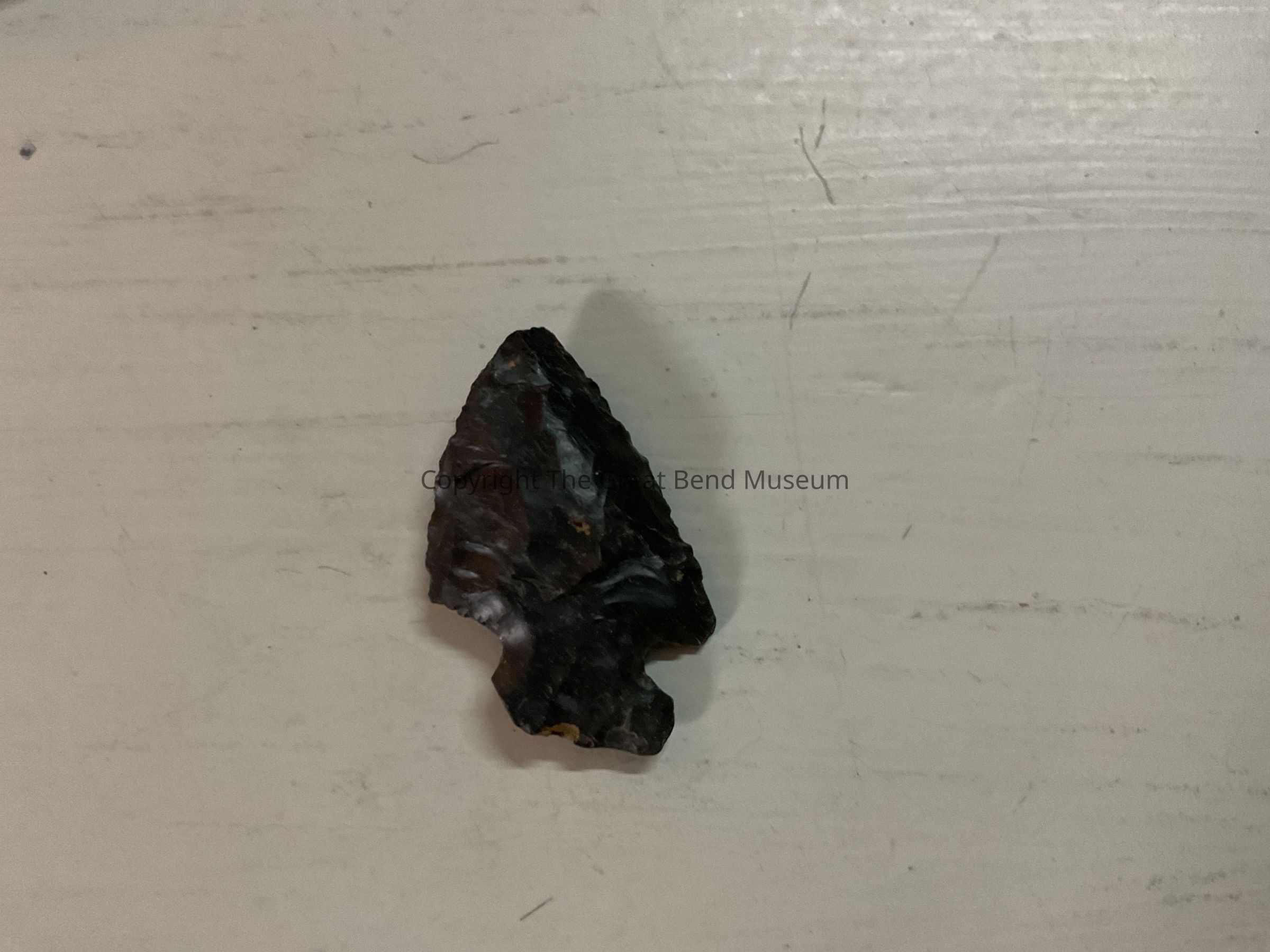Dark Gray almost Black kind of lop-sided triangle shaped point. Stem constricts then flares out at the base smal in size. Stem is flared on outer edges. Prominent shoulders. On side of stem is chipped at the base.Acquisition