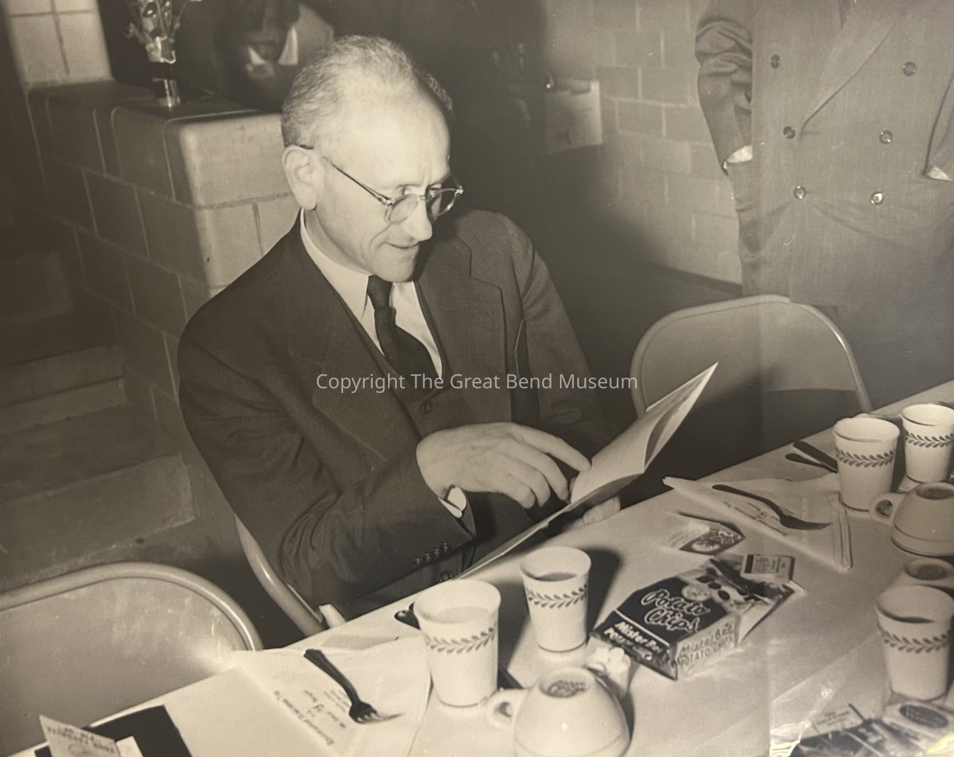 Philip Sporn sitting at table reading a paper/program. On the table is a bag of Mister Bee Potato Chips, a book of matches, drinking cups.Acquisition