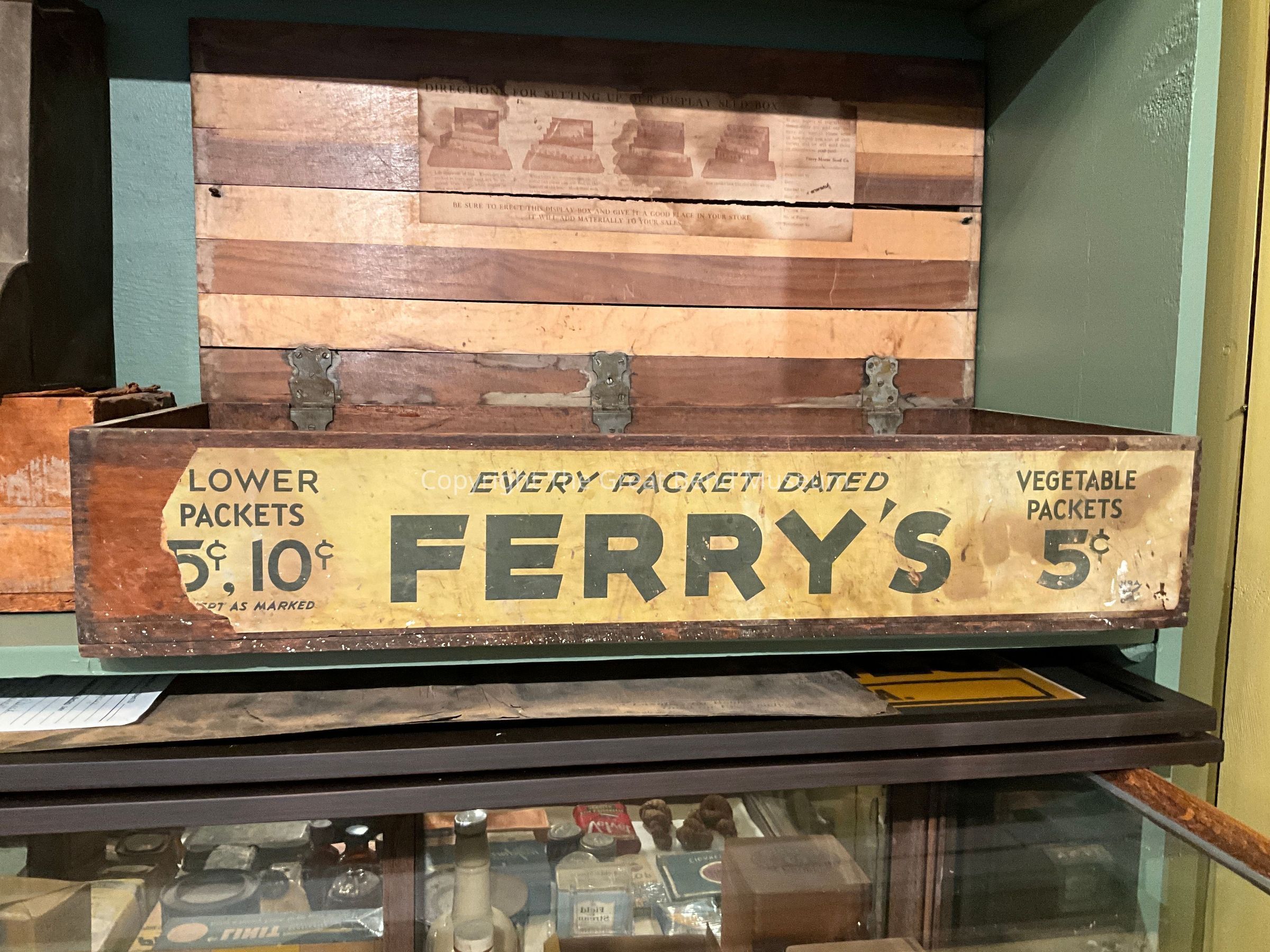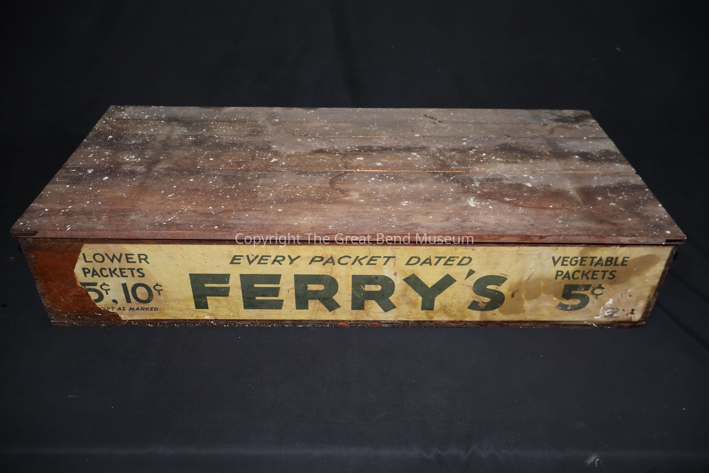 Wooden box was a display for "Ferry's Vegetable Packets 5¢" Advertising "Every Packet Dated" Flower packets 5¢, 10¢. Has directions on the inside of the top-cover of how to assemble the display - Joints are dovetailed. Paper labels. Box made by Ferry-Morris Seed Co.Acquisition