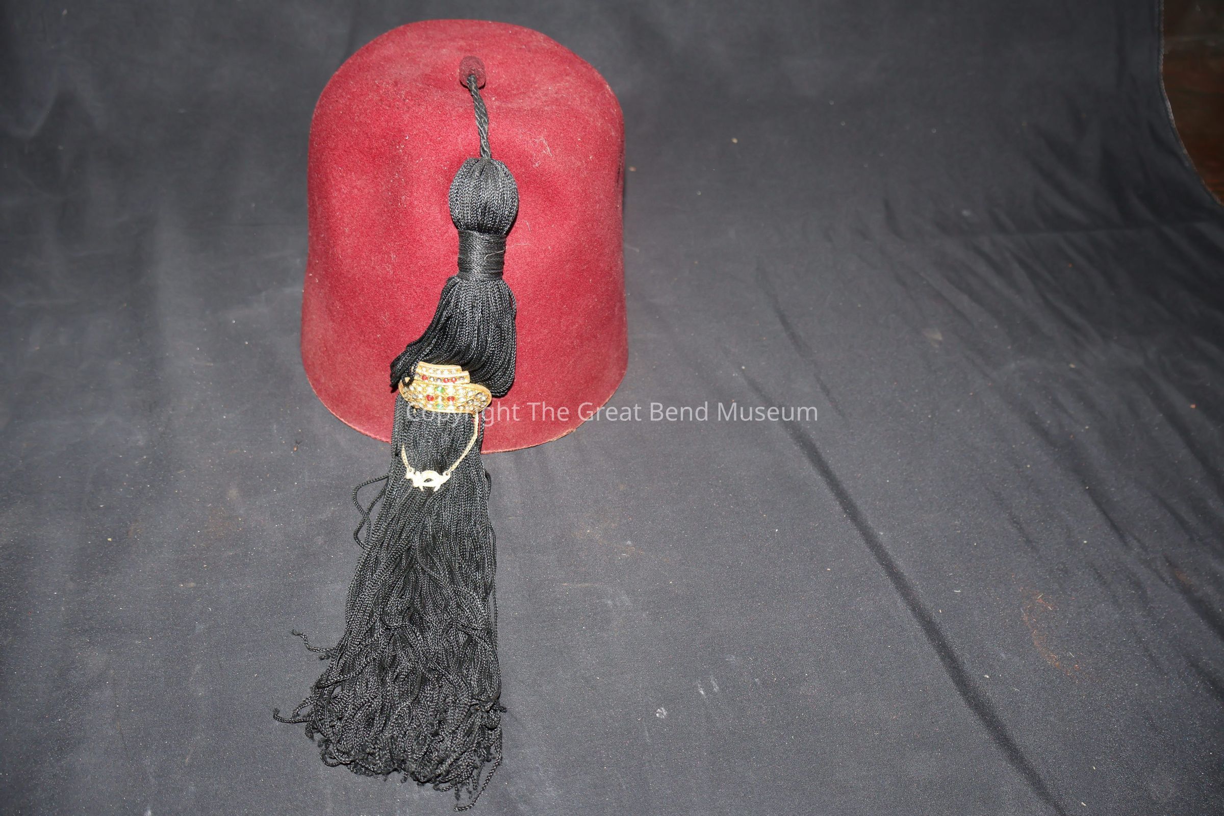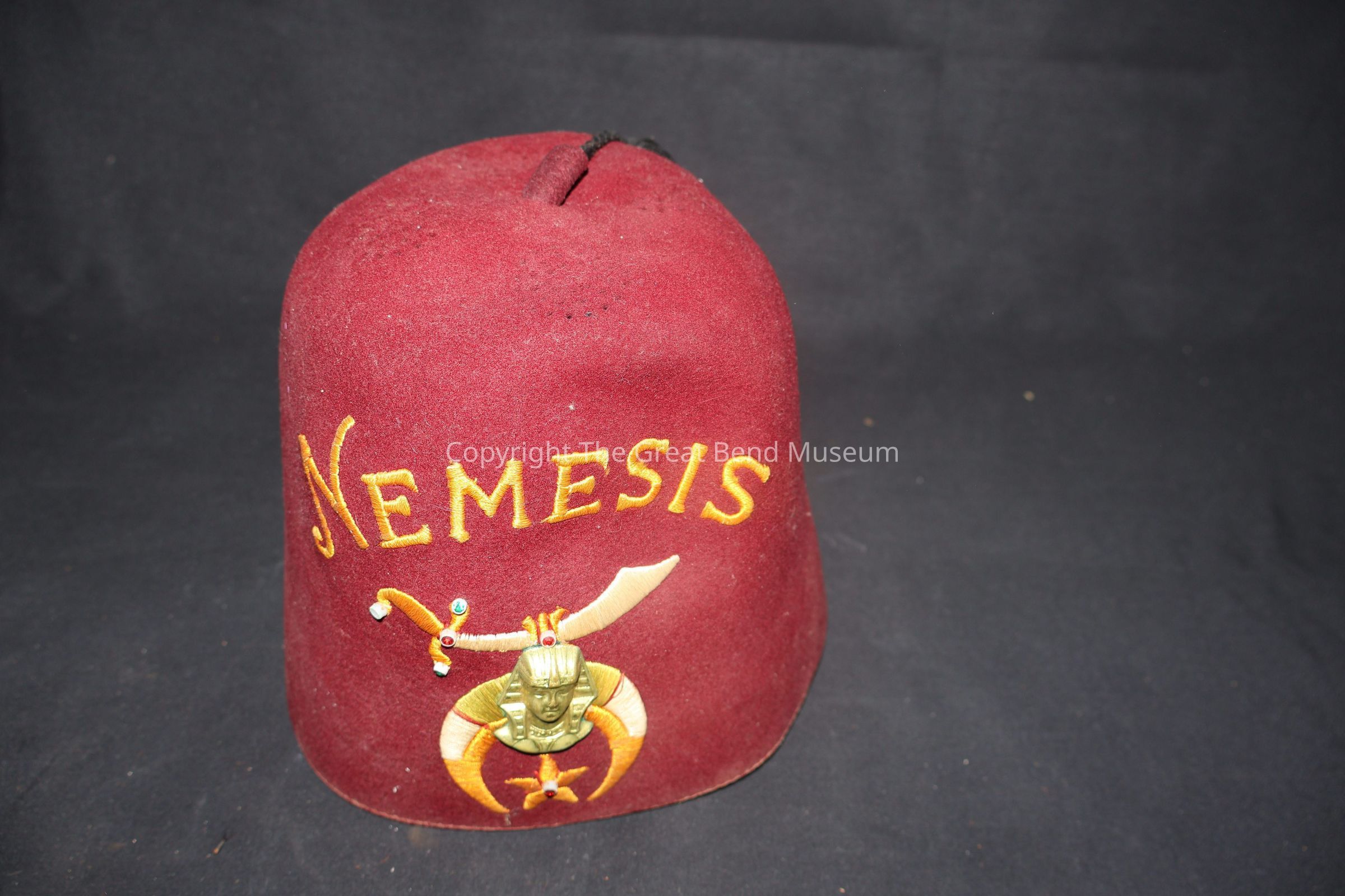 Maroon Fez hat, dome shaped, nemesis with a sword stitched on the front with an Egyptian on the front, air holes stamped on top, black tassl with a jeweled pin on it, Charles Fast stamped on the leather inside the hat.