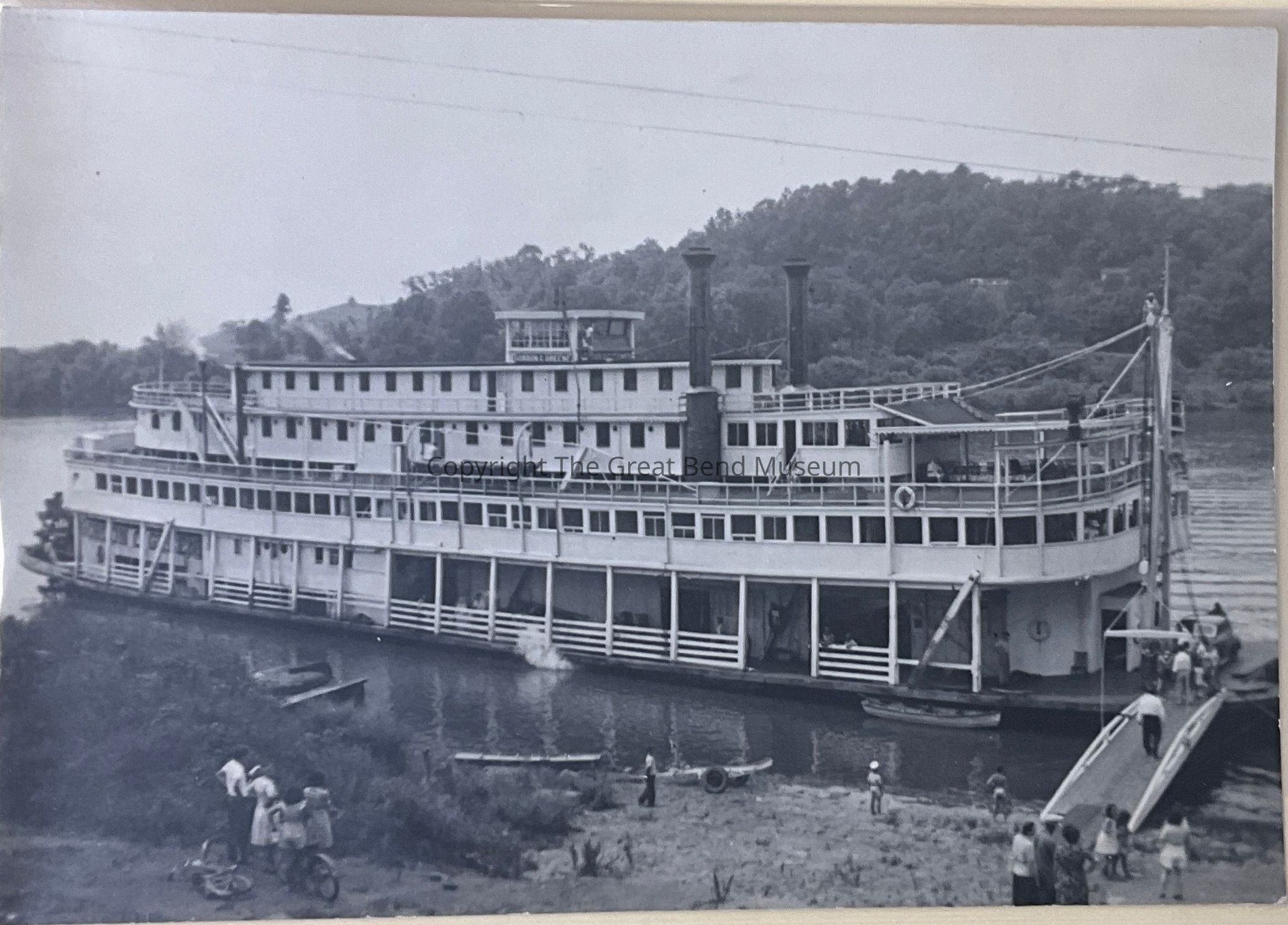 Photo of large passenger boat docked at the landing in Ravenswood. It was called Gorden C. Green. People are scattered on the riverbank and several on the boat ramp. 3 dock levels
