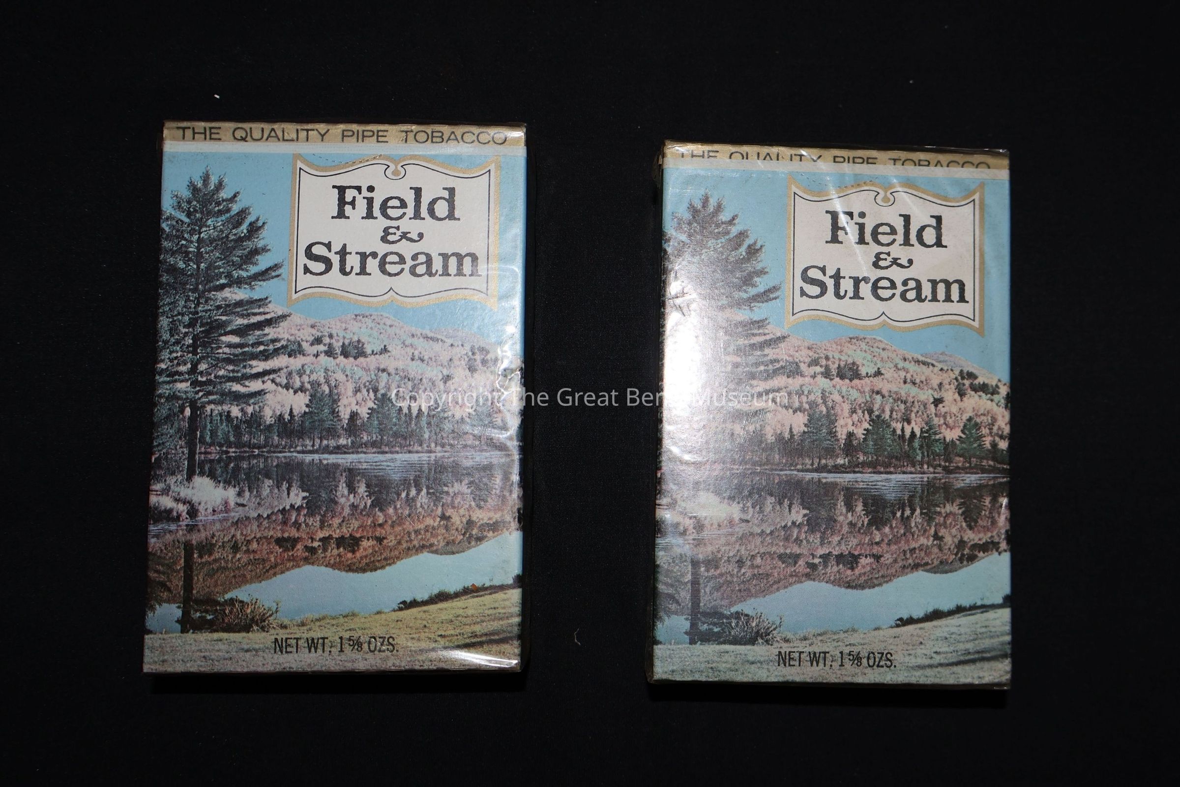 Rectangular cardboard box. Has "Field & Stream." Has picture of wooded area surrounding a lake with a beautiful blue sky. Has weight marking of 1 5/8 oz. Has "Field and Stream The Quality Tobacco" on ends. Made by oldest Pipe Tobacco Co.Acquisition