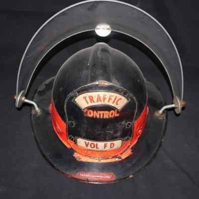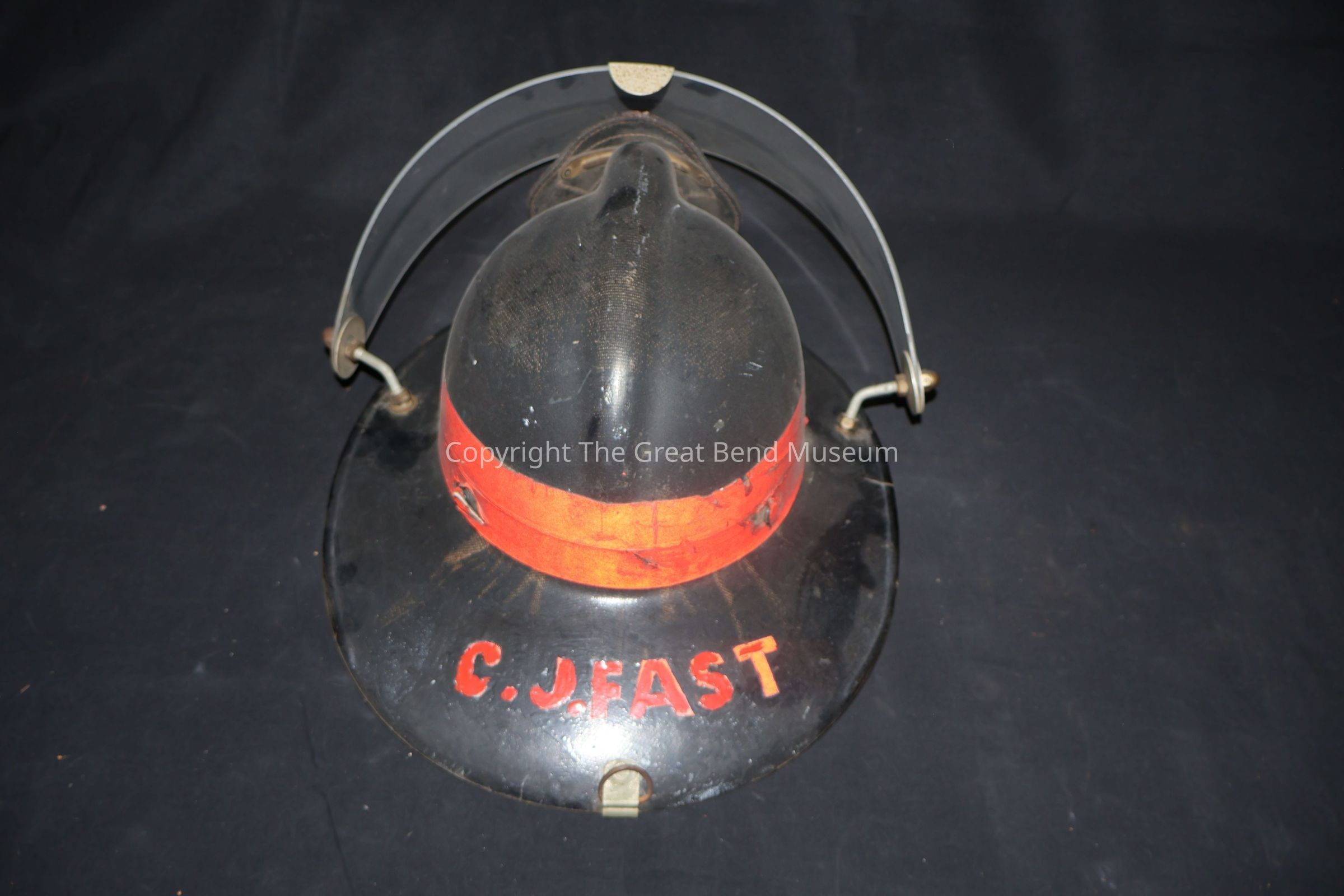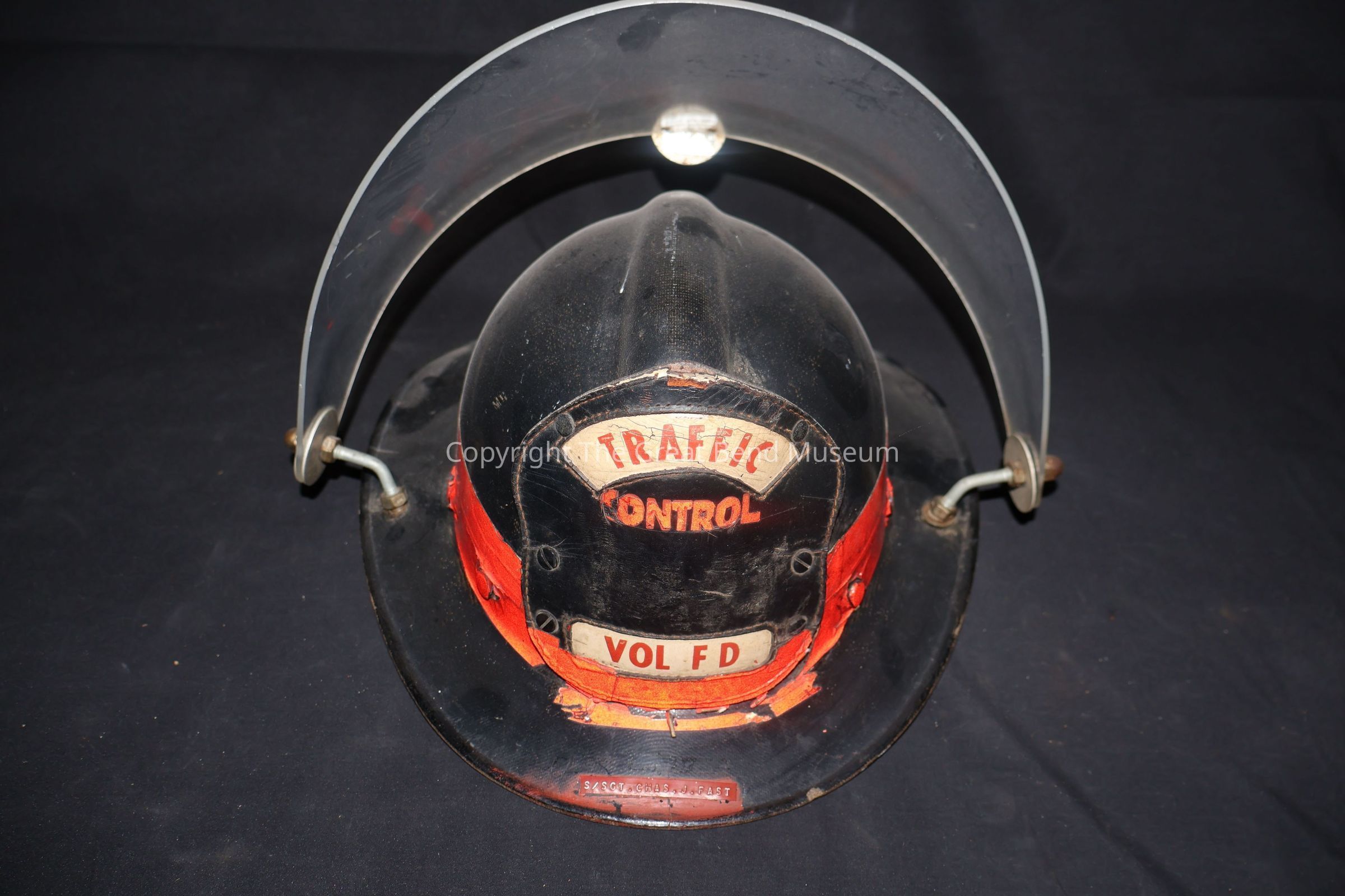 Black firemen's helmet with red line going around it, initials C. J. Fast in red on the back, Traffic Control and Vol. FD on the front. Small tag with S/SCAT Chas. J. Fast on the front. Clear face shield attached.