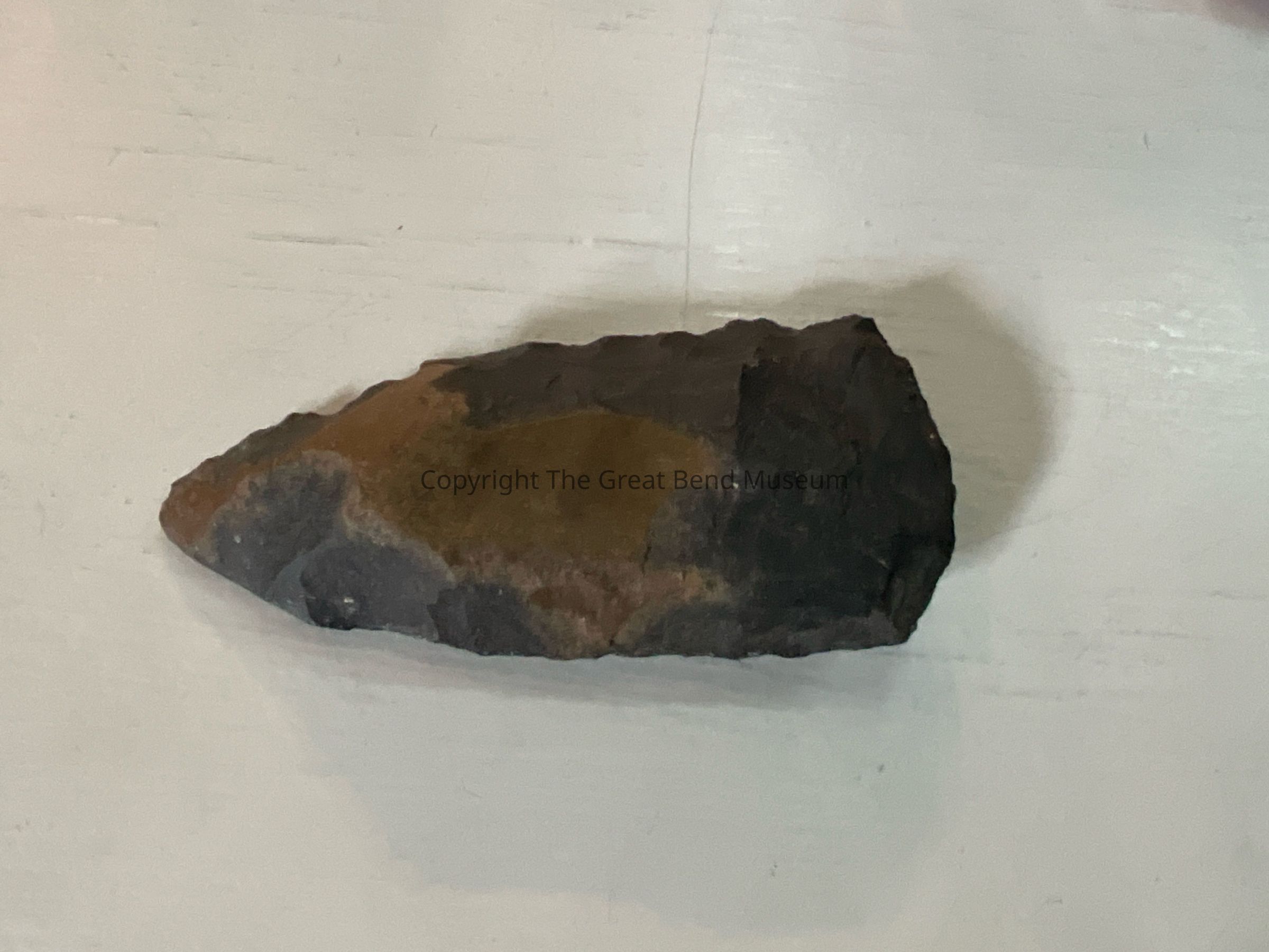 Large black flint axe head. One side of blade is shaped to a point, one side is biconvex and worked thin on the edge. . It is thick in cross section. Has brown color running through the piece.Acquisition