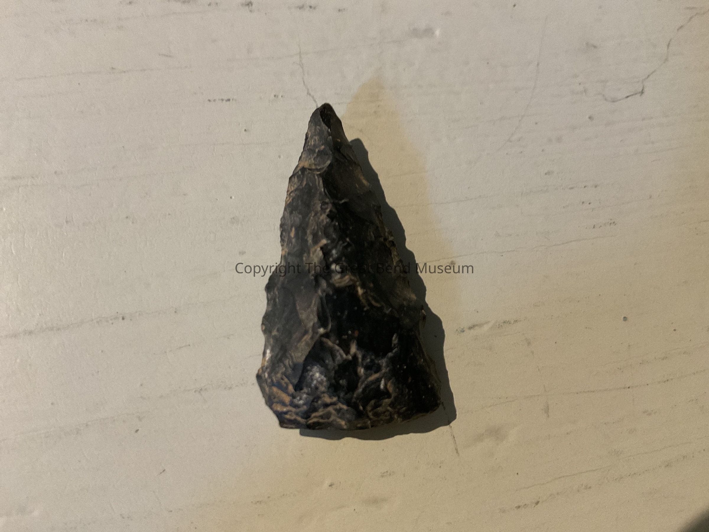 Isosceles triangle shaped blade. Sides of blade are serrated and basal edge is straight. Blade is dark gray almost black. Blade is a small point.Acquisition