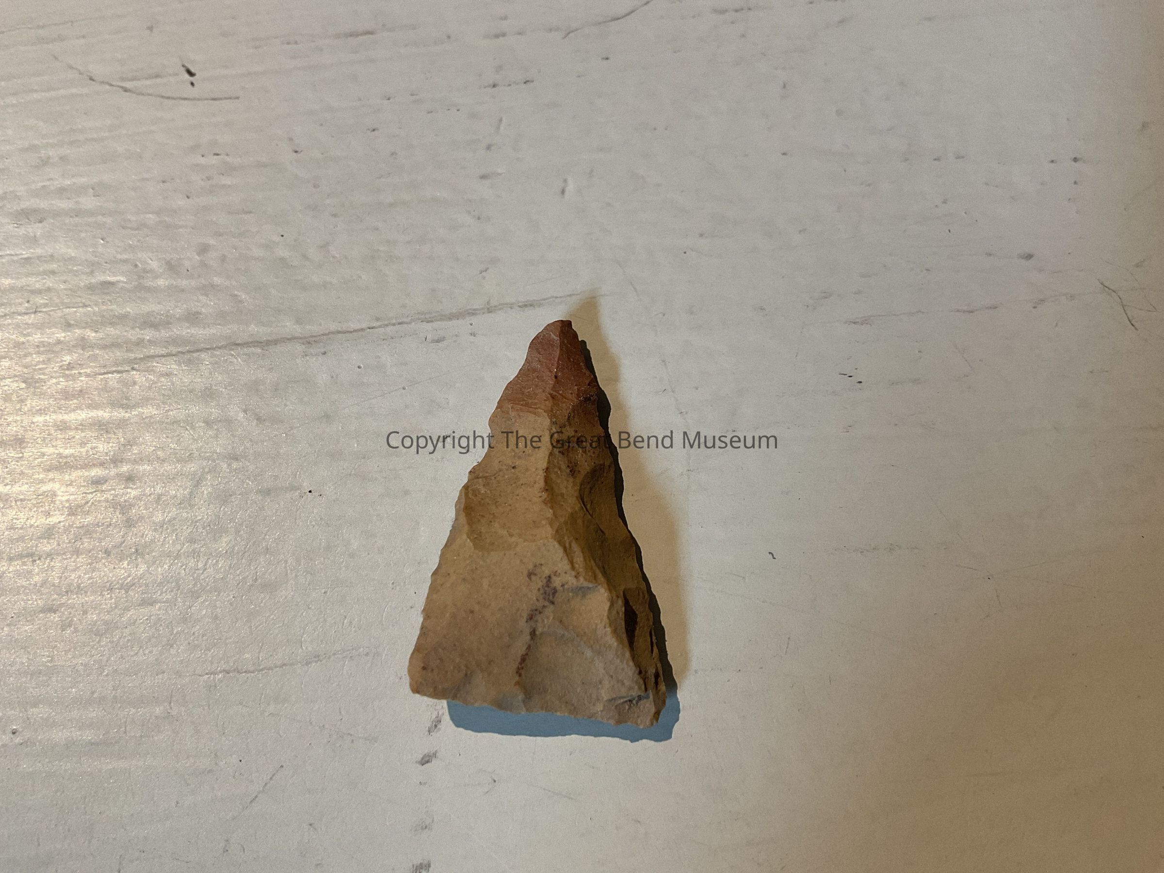 Slender isosceles triangle shaped point. Base is straight, color is light brown. Edges are serrated from resharpening. Basal edge has been worked ( thinned) .Acquisition