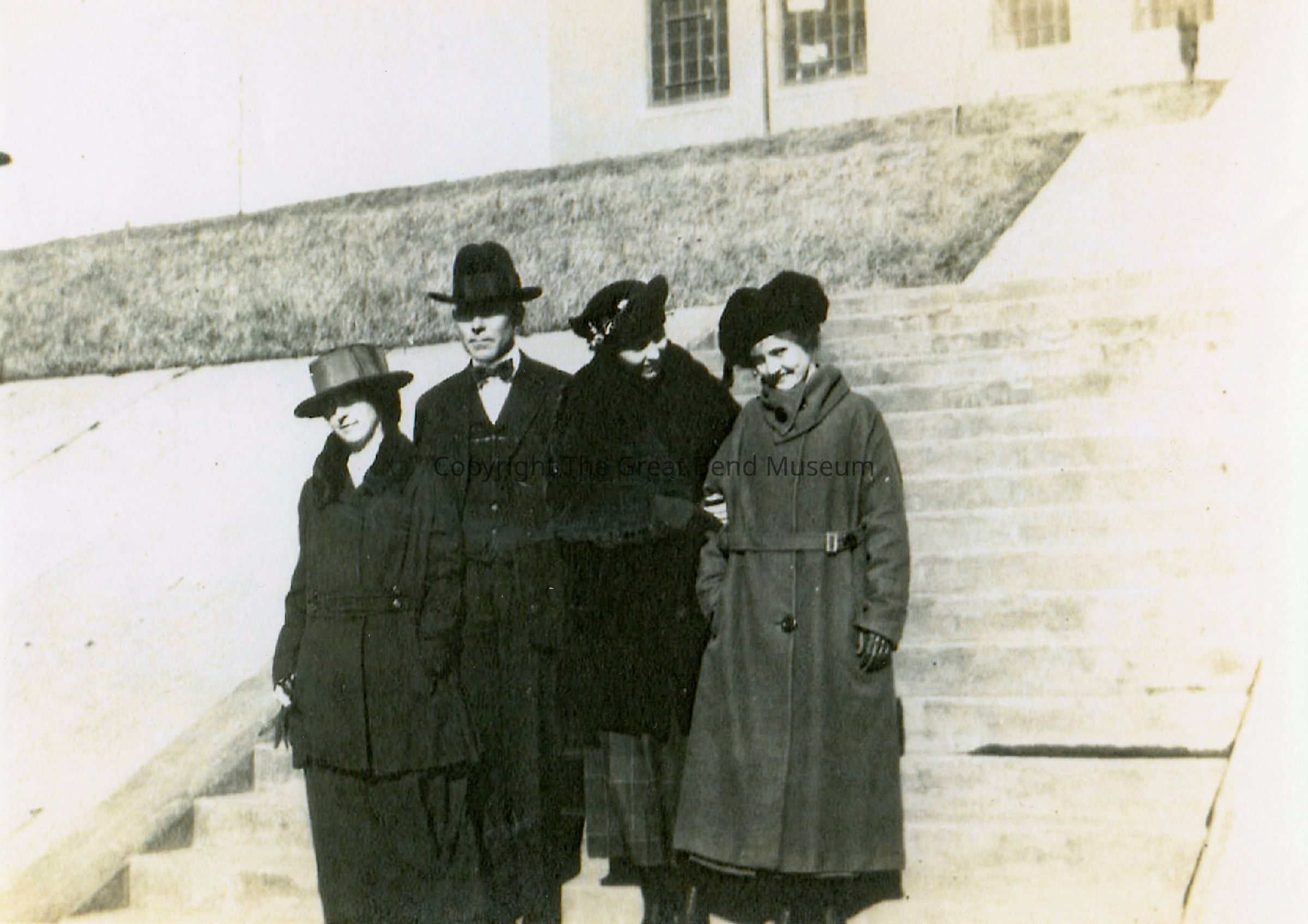 Man and 3 women on stairs at Lock 22 going down to the river. They have winter coats on and all are wearing hats.Acquisition