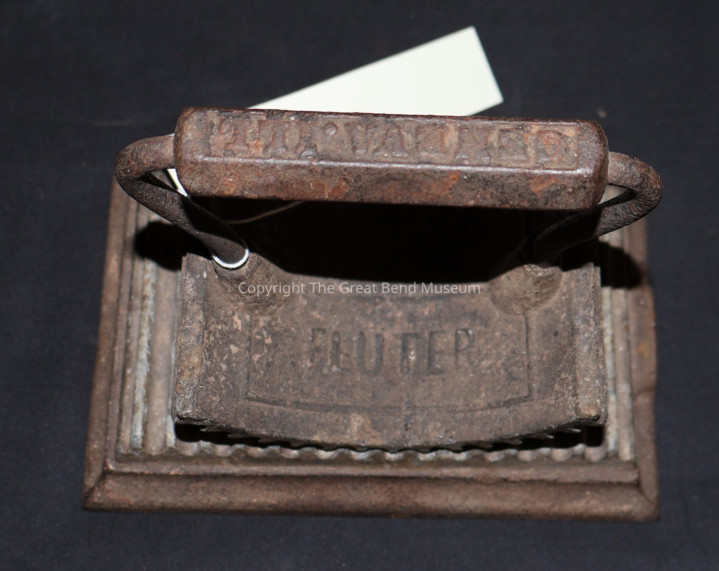 Cast iron base - corrugated with separate metal handle and matching corrugated metal rests on the base which when hot - irons pleats into fabric.Acquisition