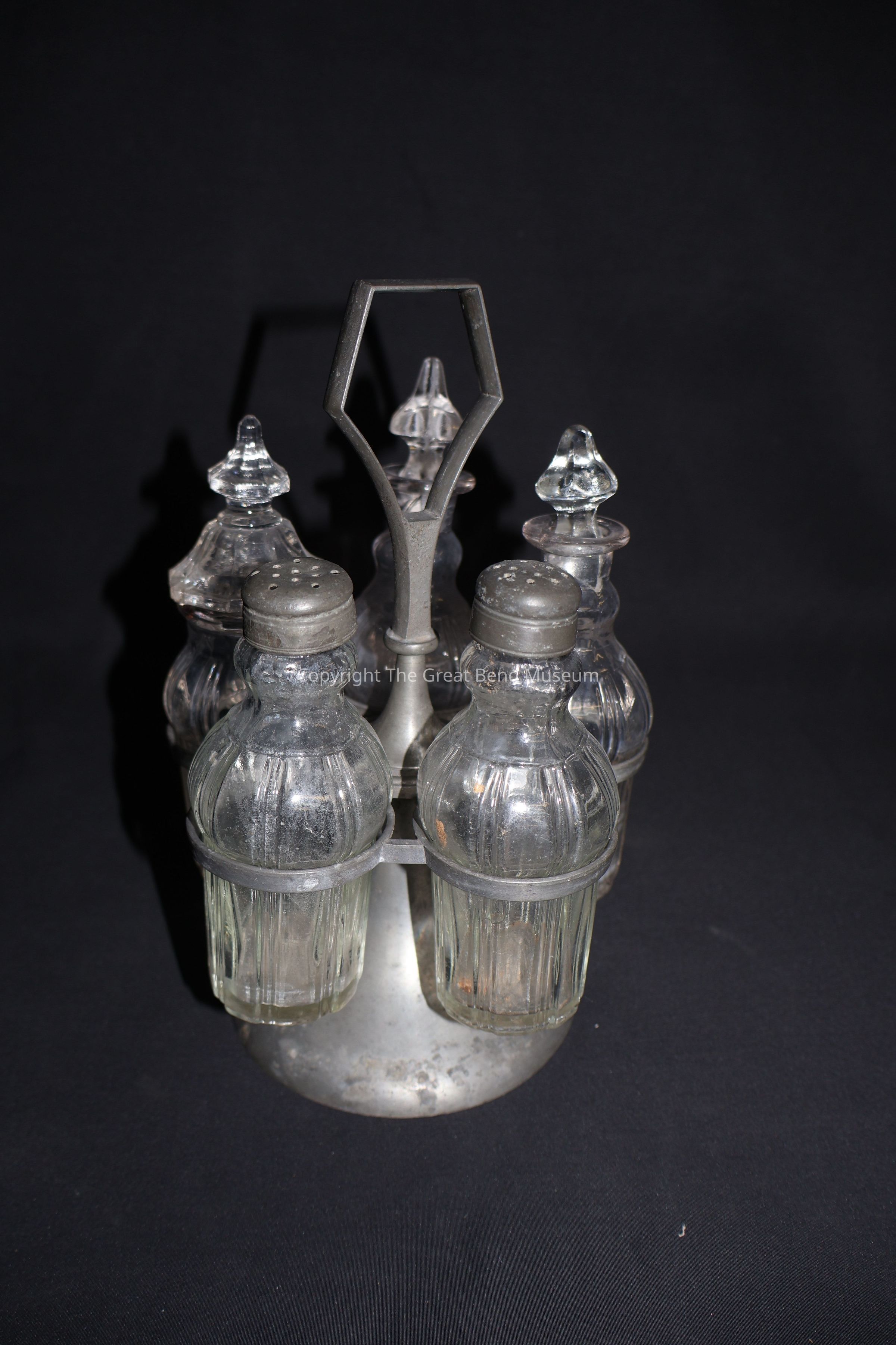 cruet set has 5 glass containers that would be used to hold seasonings, such as salt, pepper, mustard, vinegar + oil, and would be set on the dinner table. The stand is made of Pewter, three of the glass jars have glass lids/ stoppes, 2 have pewter lids with holes for salt and pepper shackersAcquisition