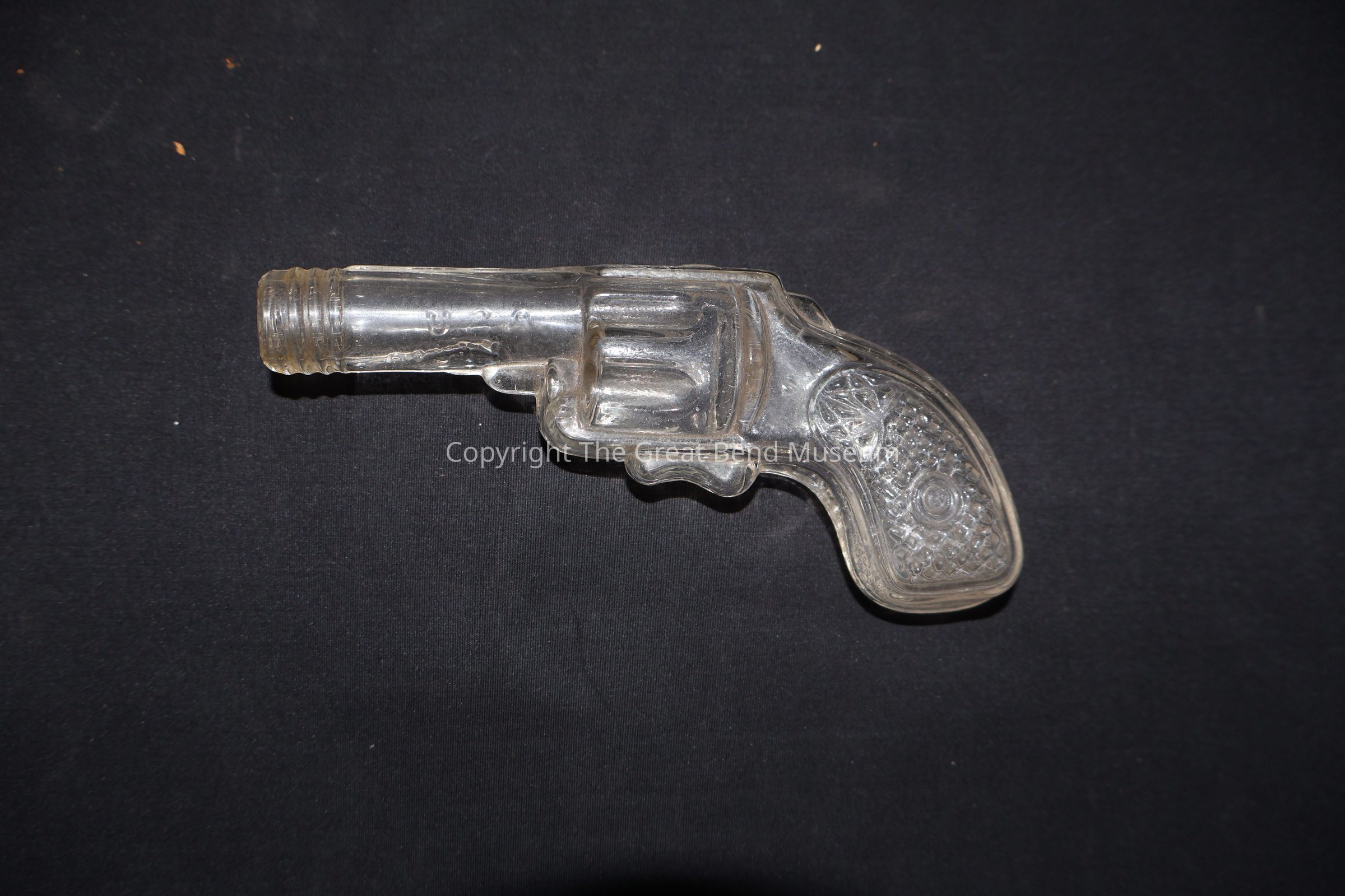 The label says, “Glass gun bought and filled with hard candy about 1920.” “Glass gun 1920s-this novelty was filled with hard candies.” It is revolver style gun with a threaded tip for a cap. It is molded with a seam along the length. It is clear and uncolored glass. It has a barrel that says, “USA AVOR 102.” The “S” is backwards.Acquisition