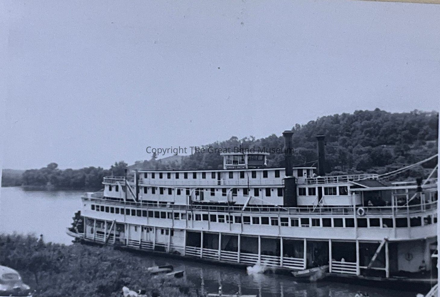 Photo of the steamer (copy) Gordon C. Green moored at the ferry landing in Ravenswood. Boat has 4 levels along with the traditional steam stacks. Appears to be warm weather - leaves full and grass on bank is tall.Acquisition