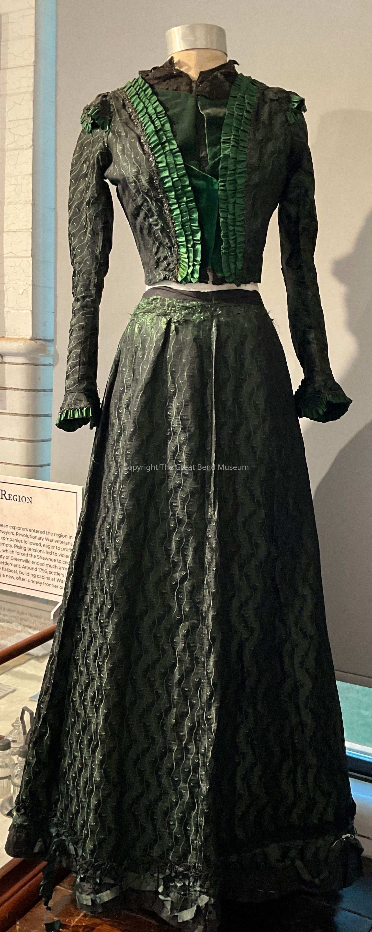 Dark green long formal dress - silk with black lace trim ad black design in the material. Black inlet bodice under green velvet vest. Green ruffles form a V on the front of the bodice. Black lace overlay at the hem, black lace collar, skirt a-line.Acquisition