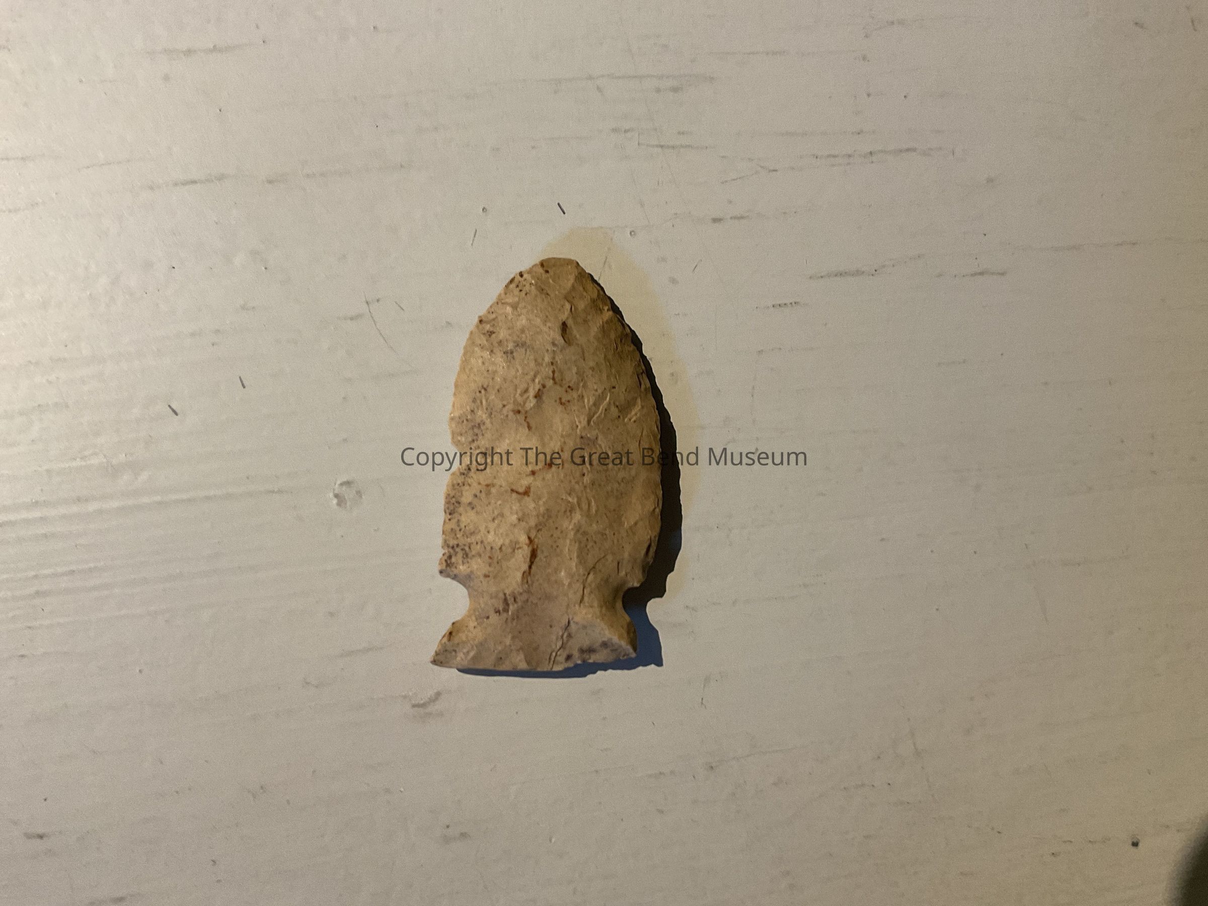 Light tan colored, side notched point. Mid-section has notch out also. One of the basal edge corners is chipped used most often as spear points or knives.Acquisition