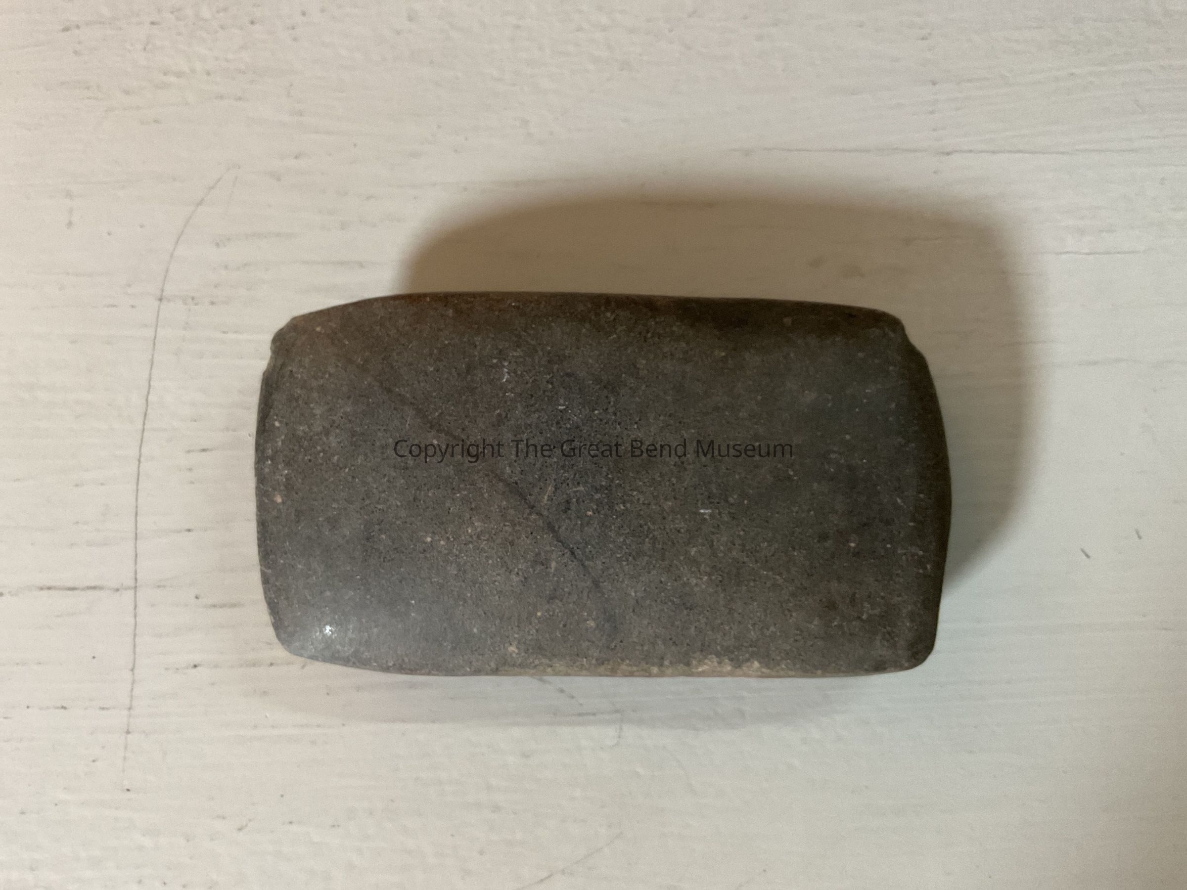 Smooth stone scraper> Top and bottom edges are flattened . Color is dark brown with gray. Solid stone, heavy.Acquisition