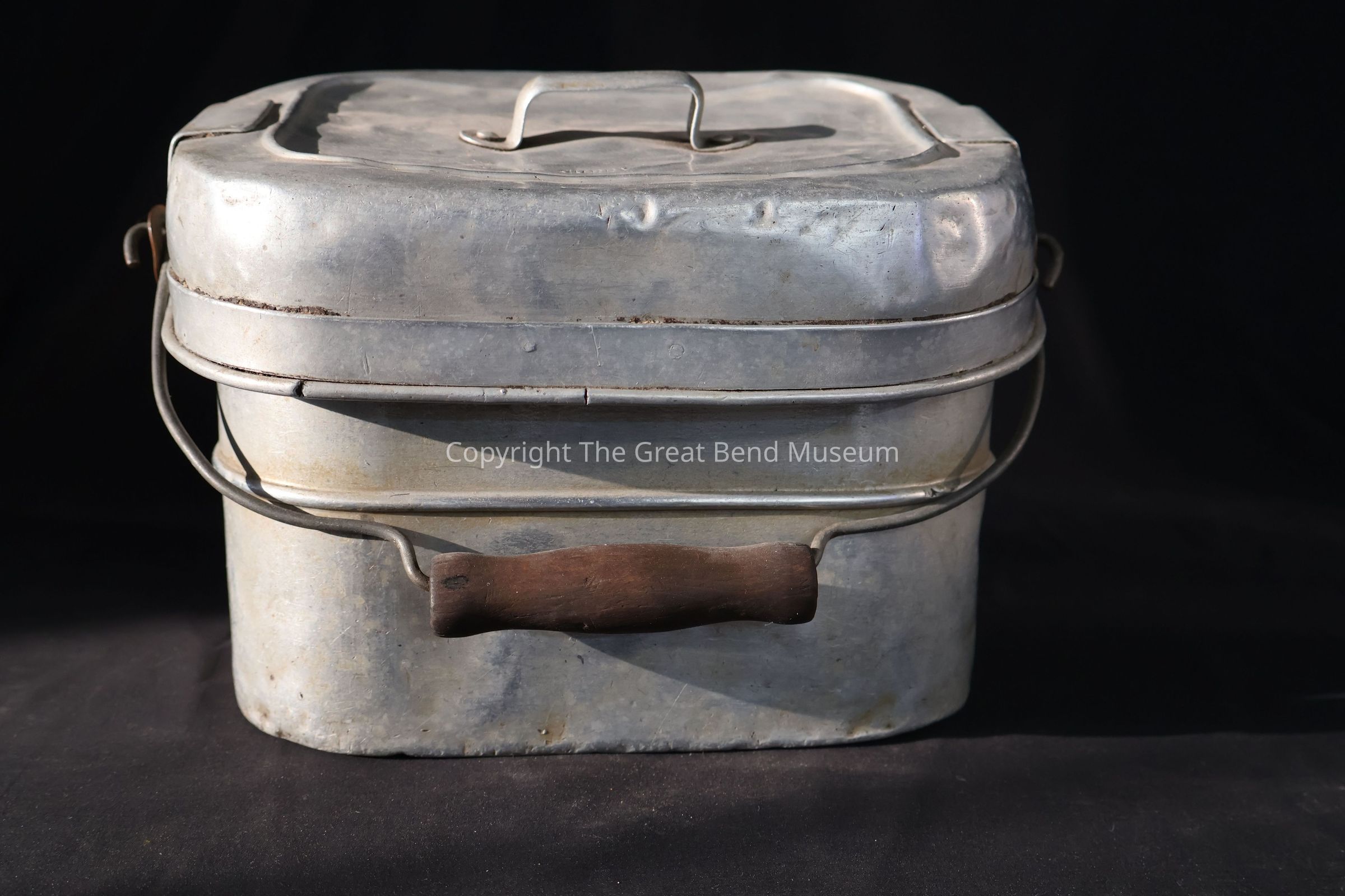 Tin lunch box with lid, has a small lidded pail inside. Both have lids and metal handles. The lunchbox lid has GW Curry on the top, it has some cracks and is banged up. Lunch box handle has wood in the center.Acquisition
