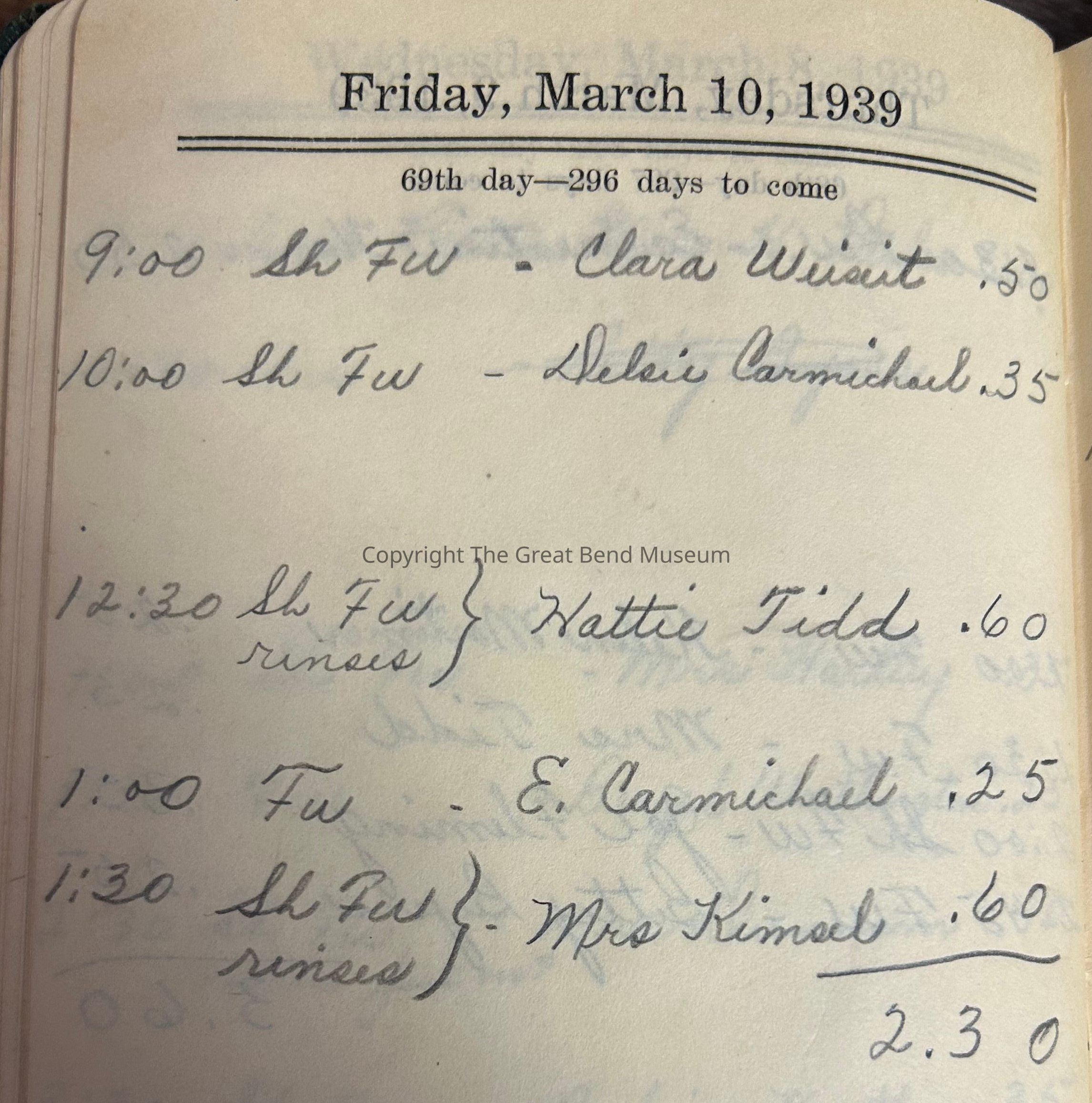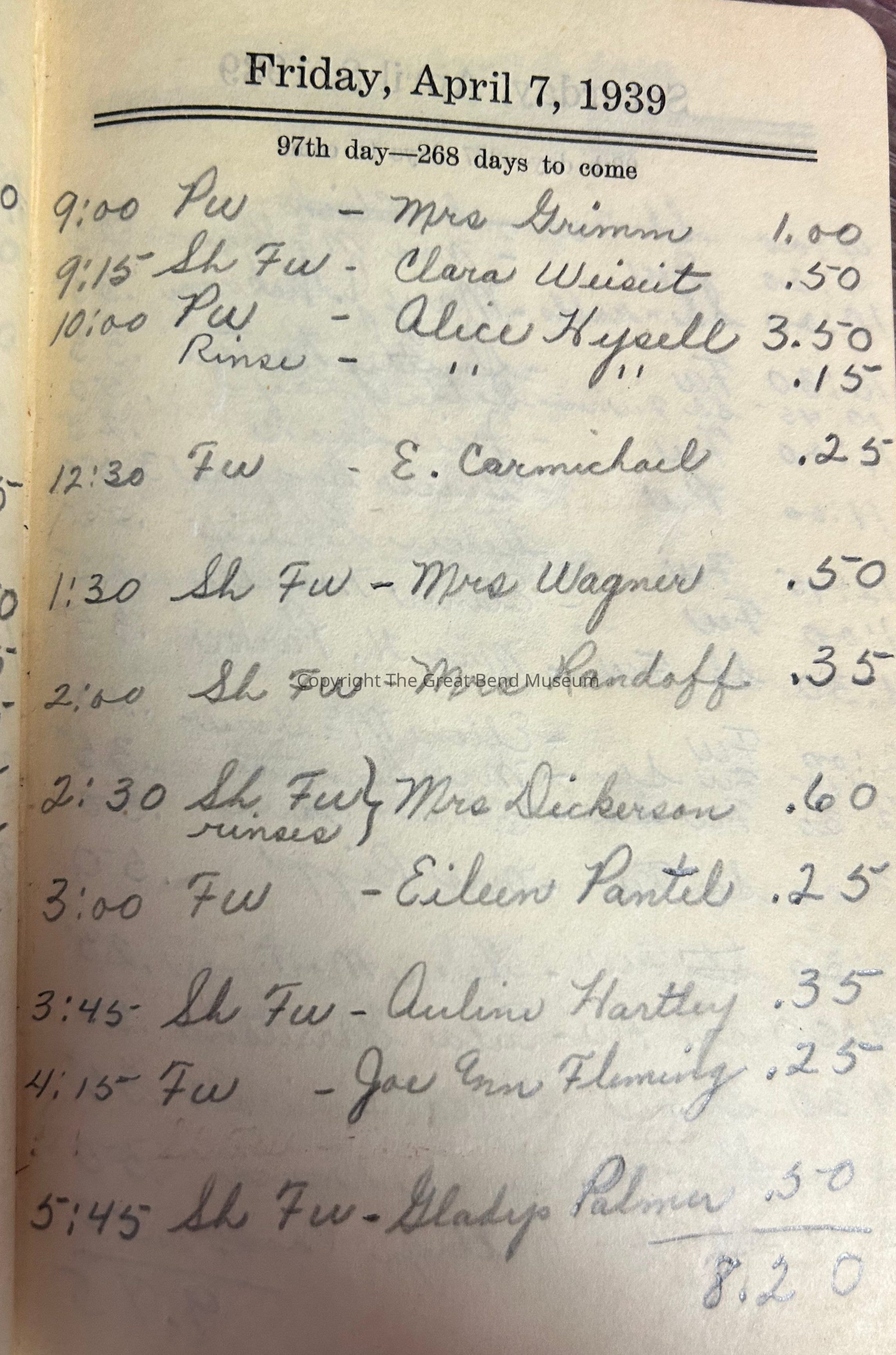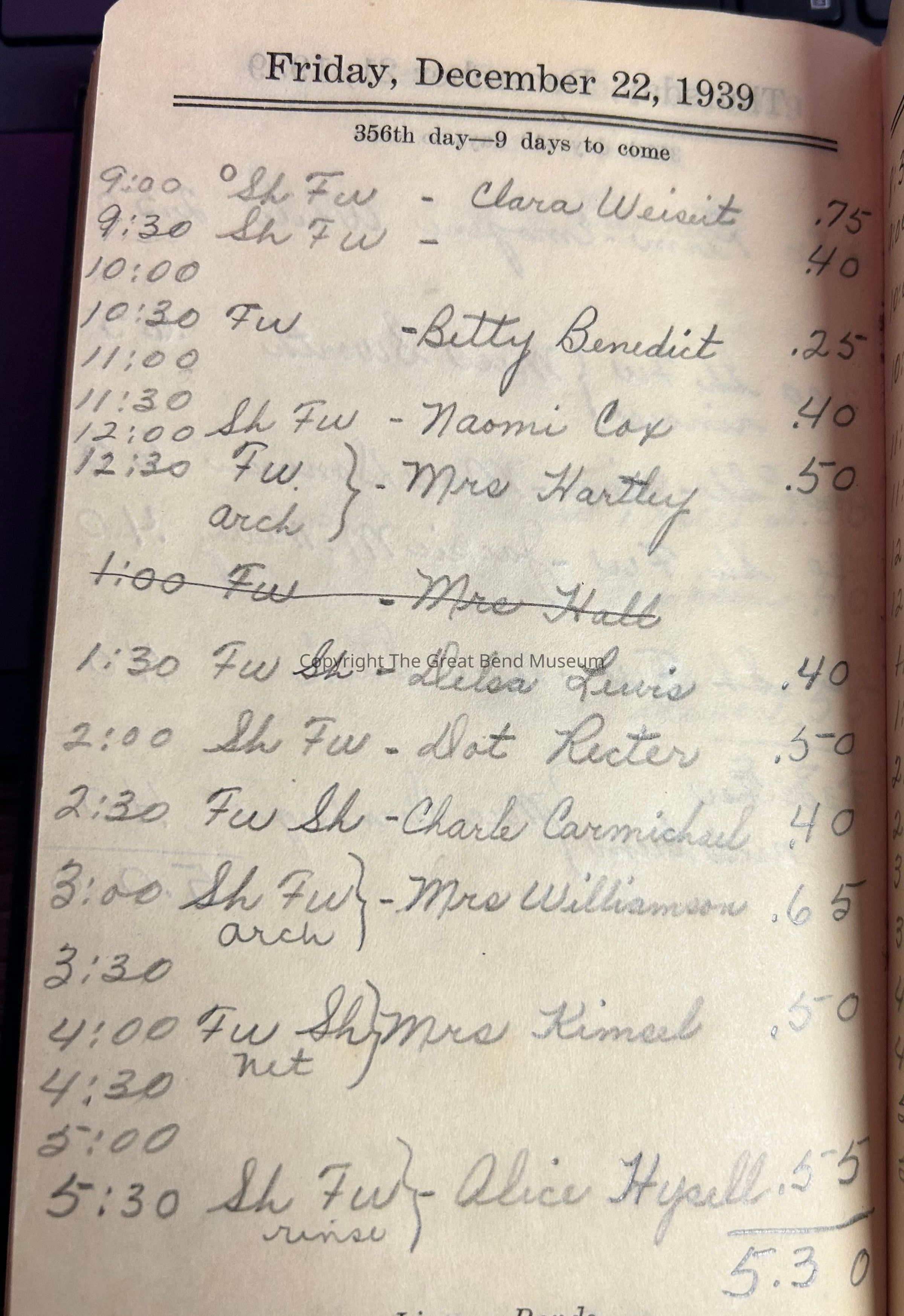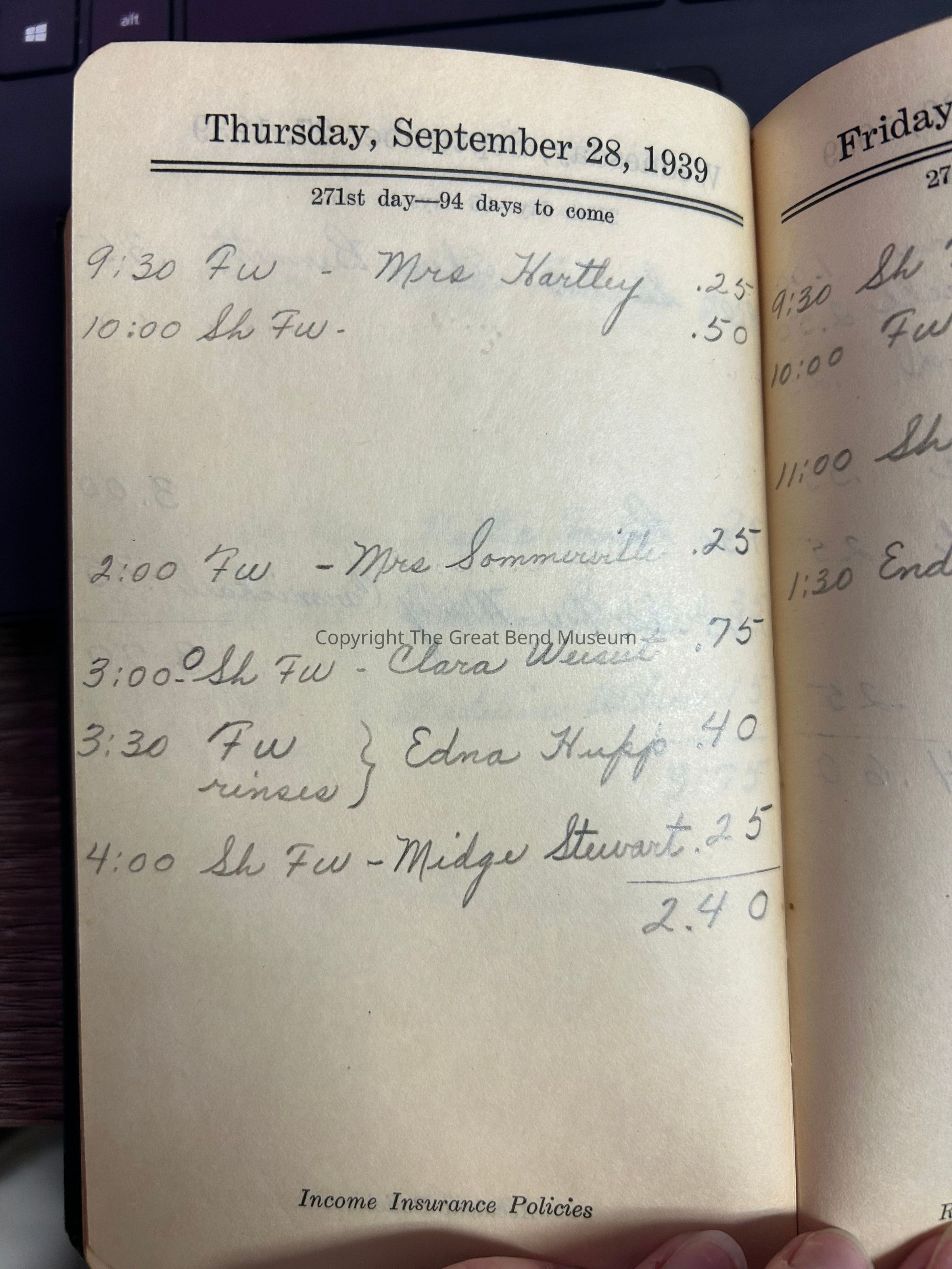 Daily planner outlining hair appointments for the year of 1939. Annual income recorded as $978.10. Owner uncertain but nearly all clients female. Some referred to as Mrs. [Last Name], others by first and last name; possibly married vs unmarried. Shop closed one day in March due to flooding, another day due to no electricity, two other days due to funerals, and one due to flu.