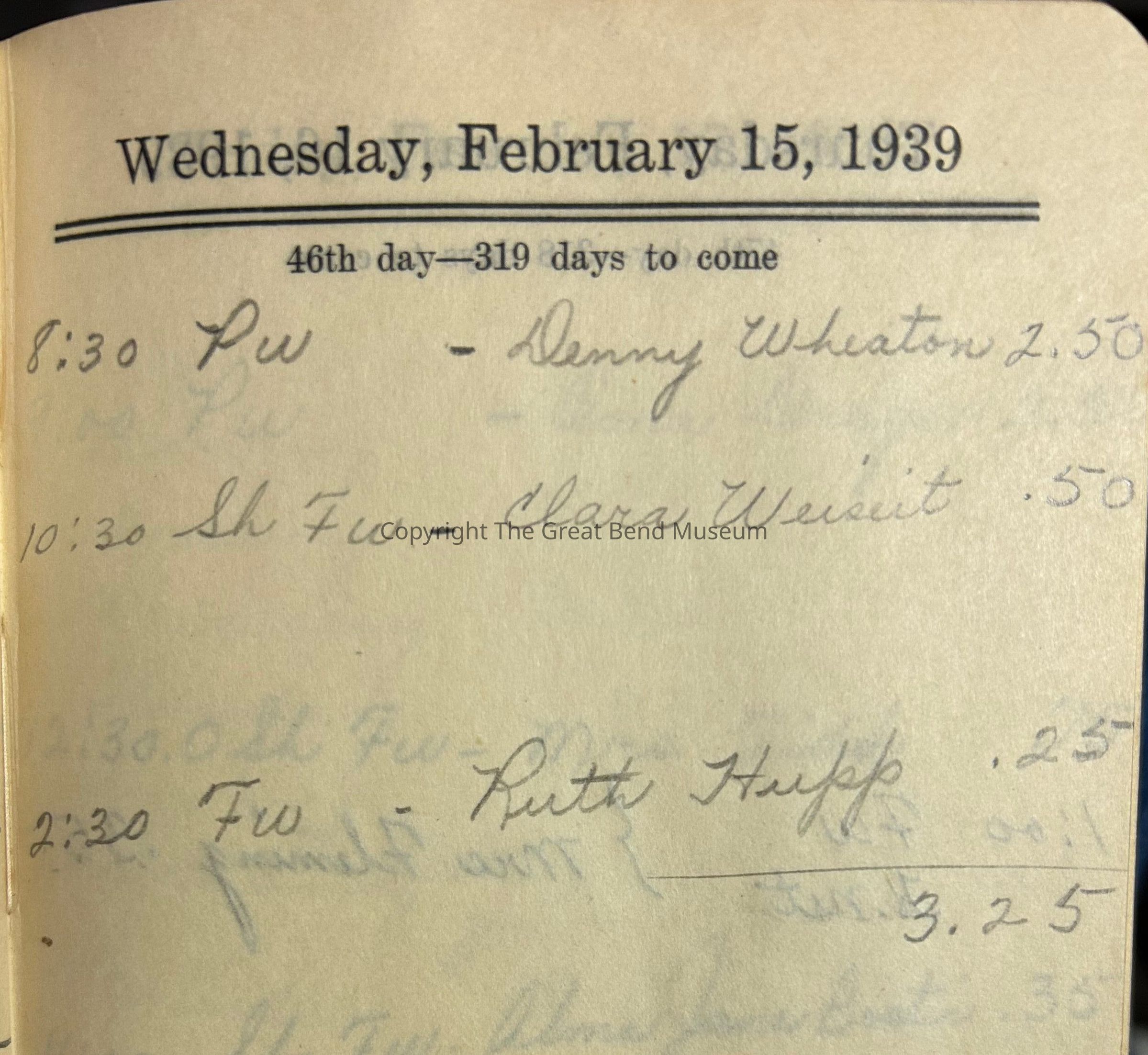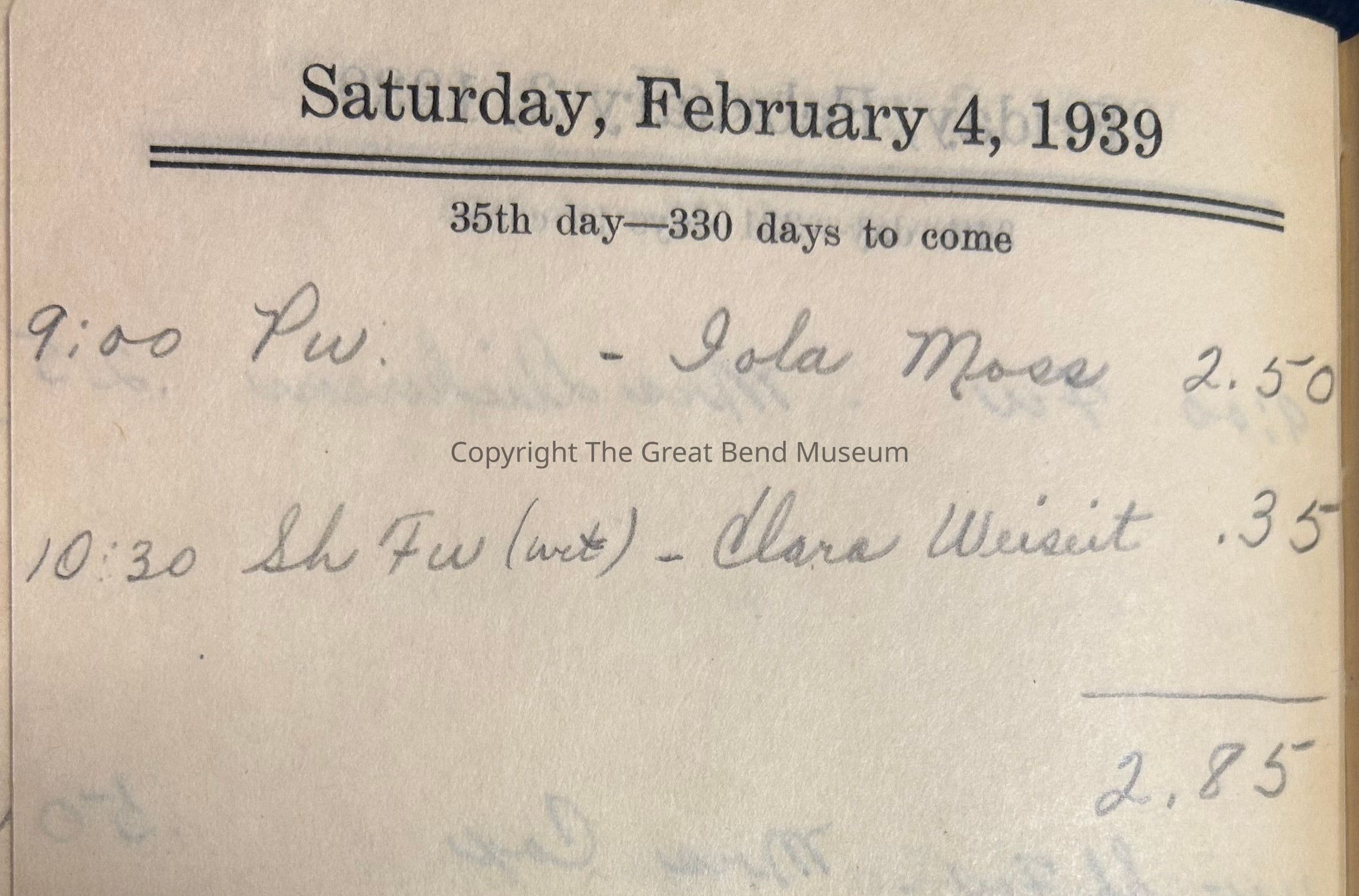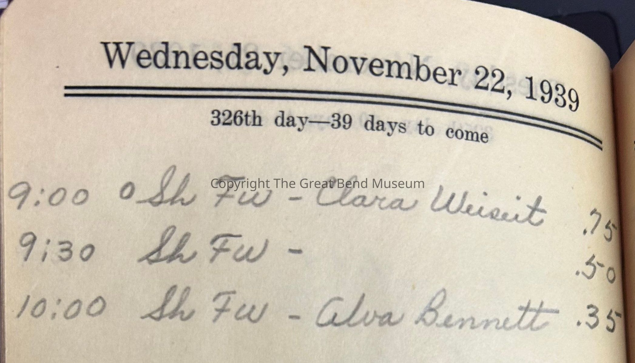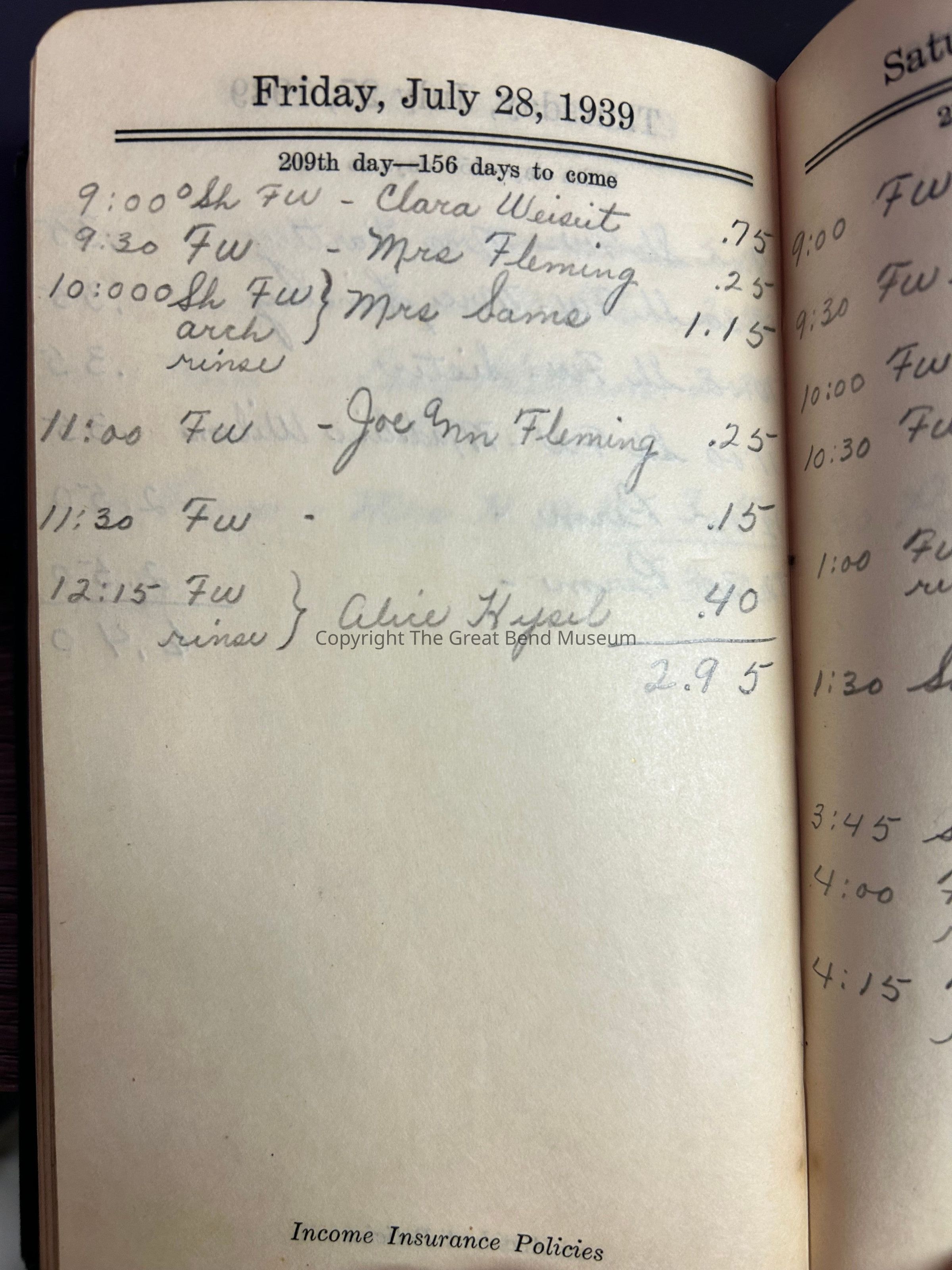 Daily planner outlining hair appointments for the year of 1939. Annual income recorded as $978.10. Owner uncertain but nearly all clients female. Some referred to as Mrs. [Last Name], others by first and last name; possibly married vs unmarried. Shop closed one day in March due to flooding, another day due to no electricity, two other days due to funerals, and one due to flu.