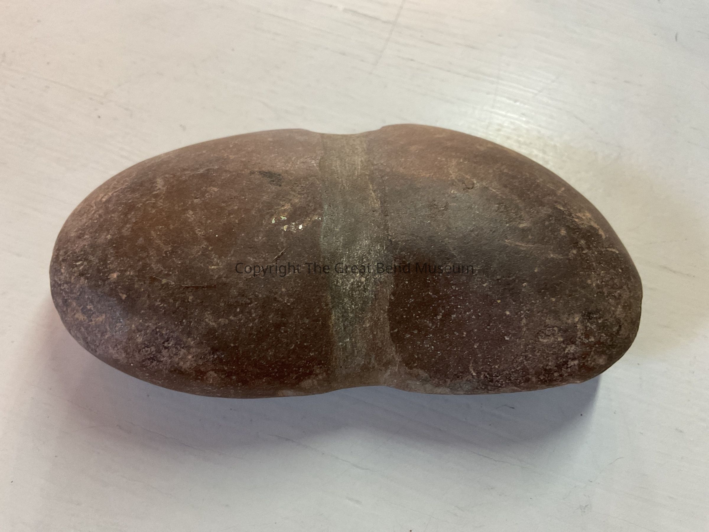 Large heavy rock smoothed and rounded on both ends. Groove worn in center of stone for attaching a handle.