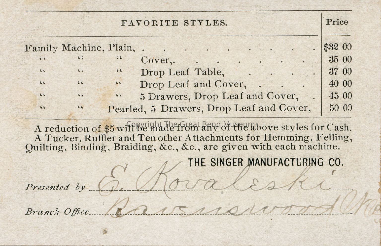 Business card for Singer Salesman who had home office in Parkersburg WV. The salesman’s name was E. Kovaleski. Card also gives prices on machines with accessories on the reverse of card.Description