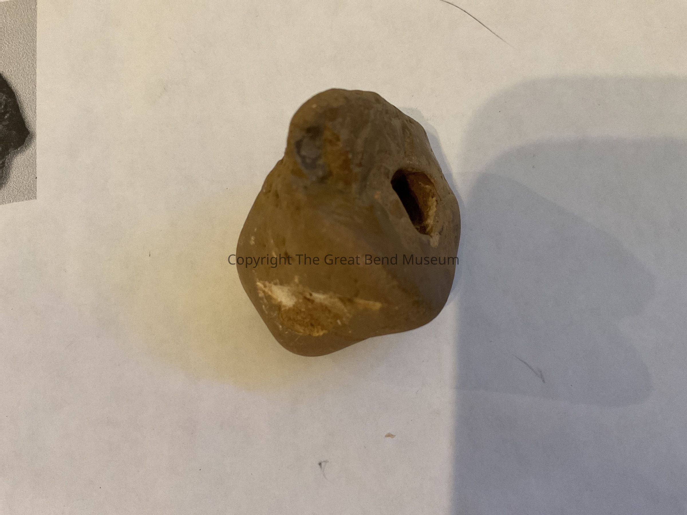 Smoothed sandstone that is flat on one side with a hole in center. It tapers to a smaller end with the other side of the hole, Brownish Gray in color. Possibly used a. Nutting stone B. Ornamental C. Plummet D. Weight for fishing nets.Acquisition