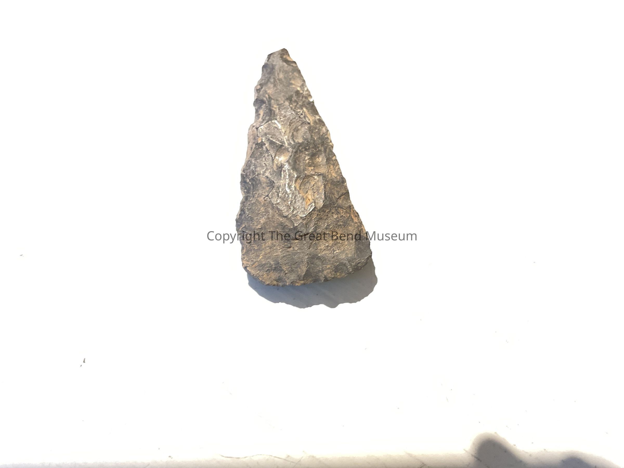 Med. Gray wide thin triangular blade.. Base is straight , to somewhat convex Color has some white running through it. Base is worked thin.Acquisition