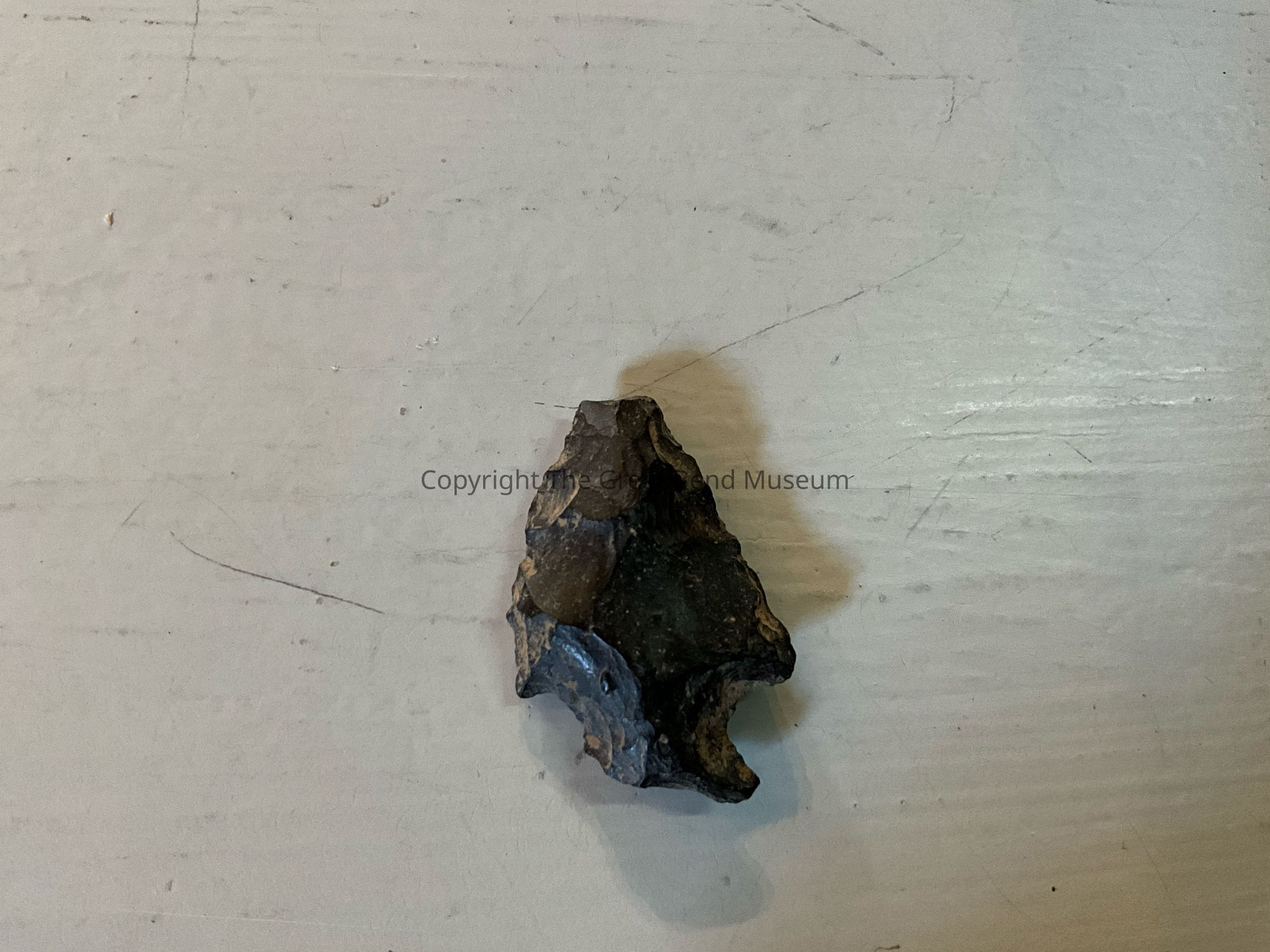 Black triangular point, with arrow shoulders and a barb on one side. Stem is flared, and has a chip on one side. Sides are slightly serrated due to resharpening.Acquisition