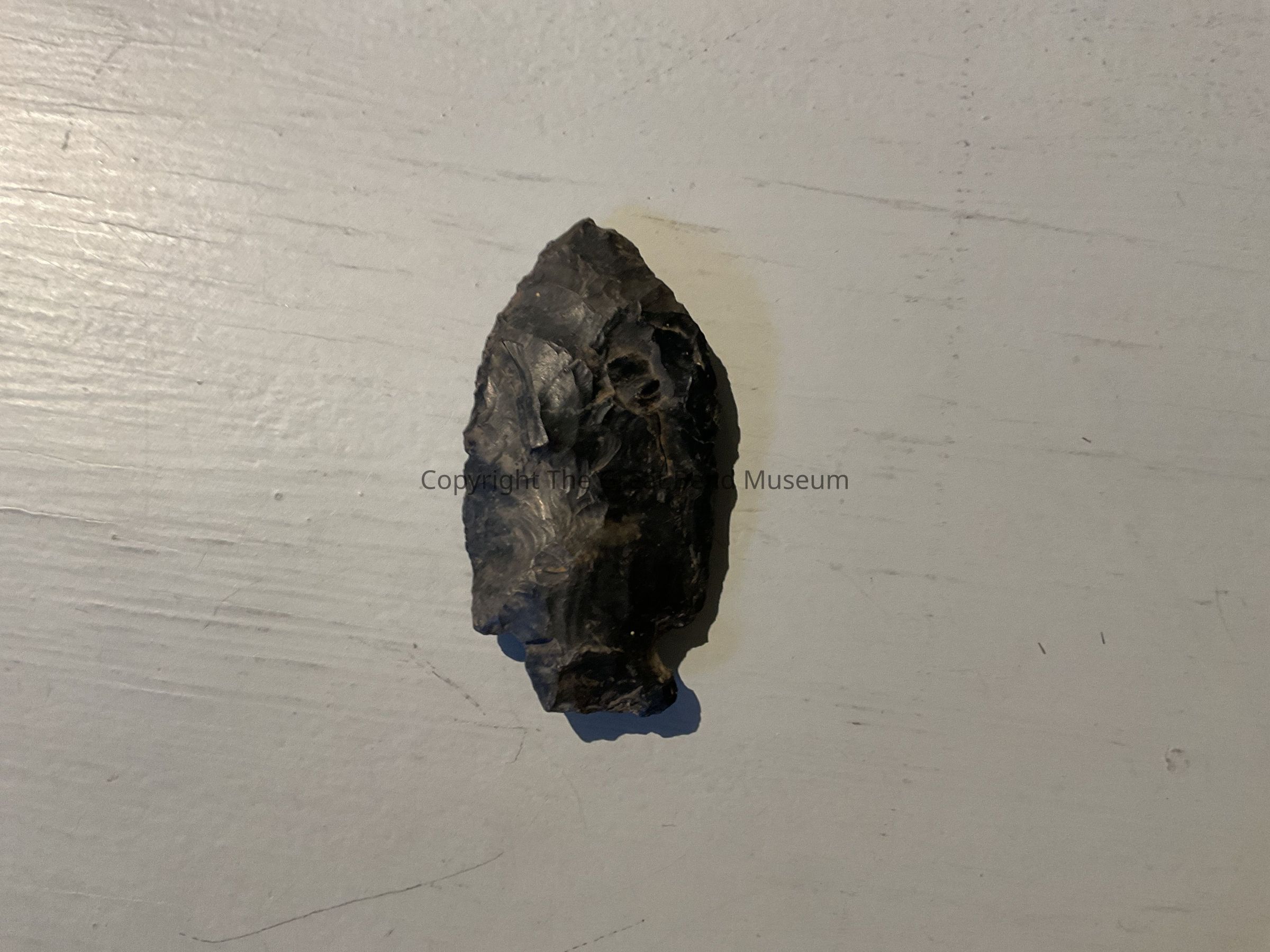 Dark Gray Flint. Large thick blade with small stemmed base. Large leaf shaped blade. Barb more prominent on one side. One side of stem is ground down. Very thick blade.Acquisition
