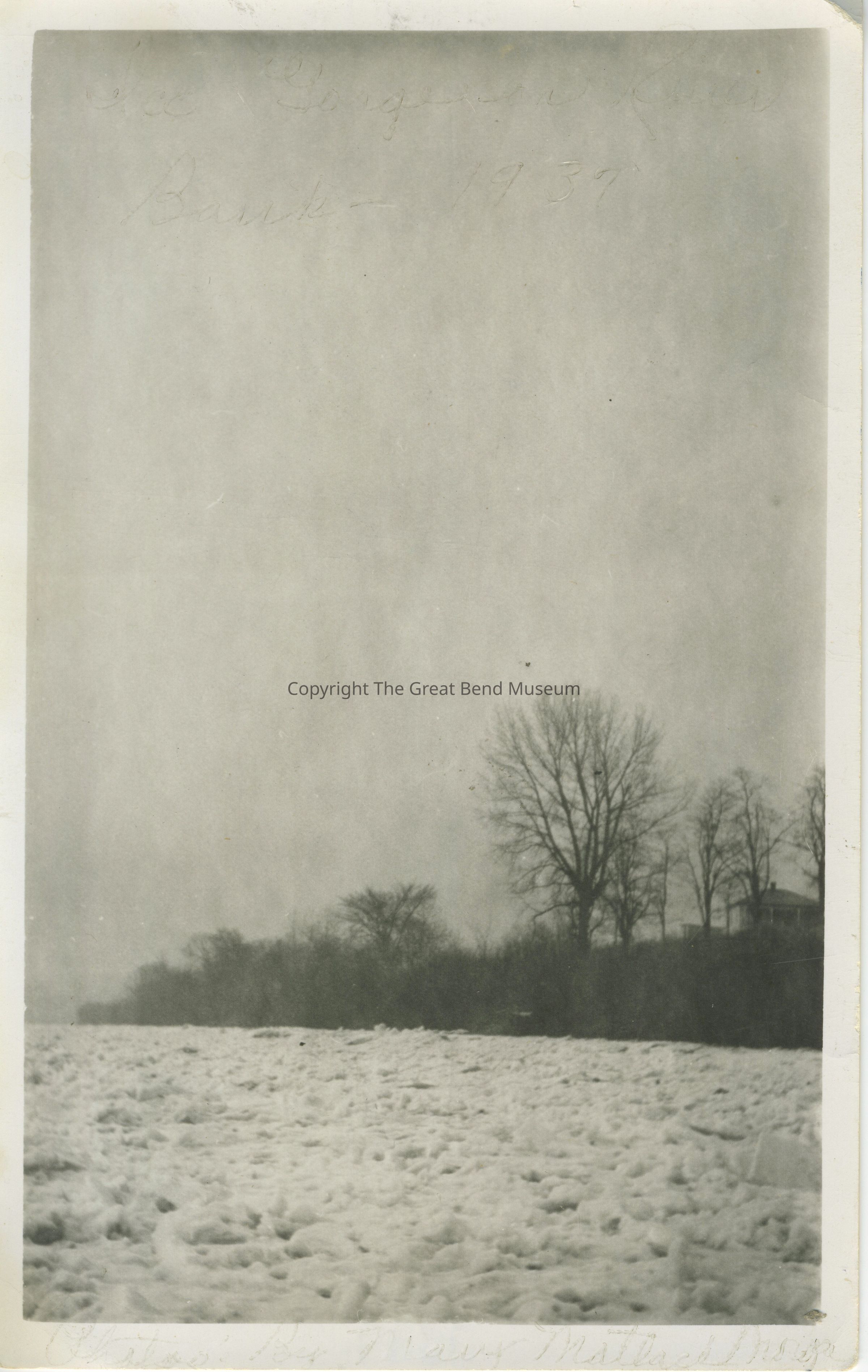 Black and White photo of Ice gorge (chunky surface) in foreground, river bank midground with building at far right of frame. Title written on the surface of photo in pencil. At the bottom: "Photos by Mary Matlack Morgan." On Back: Title "At Ravenswood, West Virginia in the Spring of 1937." 1937 in pencil below. G680 stamped at the bottom. Photo mounted in Public Hanging BoardAcquisition
