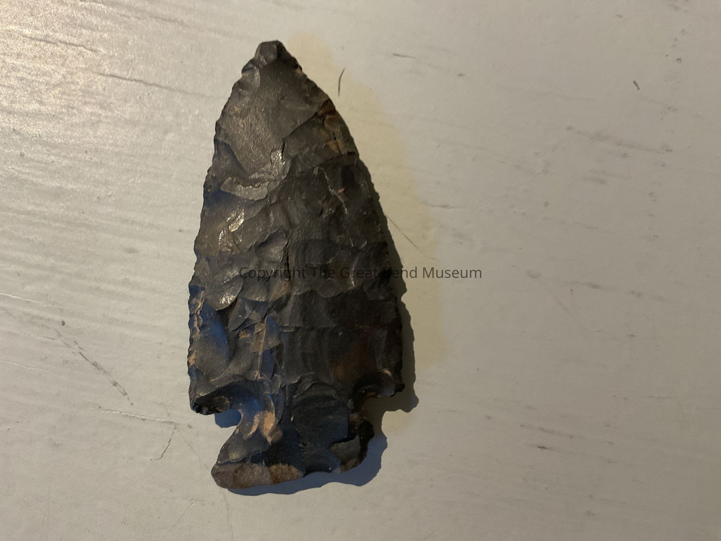 Black Flint Intrusive Mound arrowhead. Narrow leaf shaped blade with side notched stem. One side of stem is chipped, point has random flaking pattern . Thin well made point.Acquisition