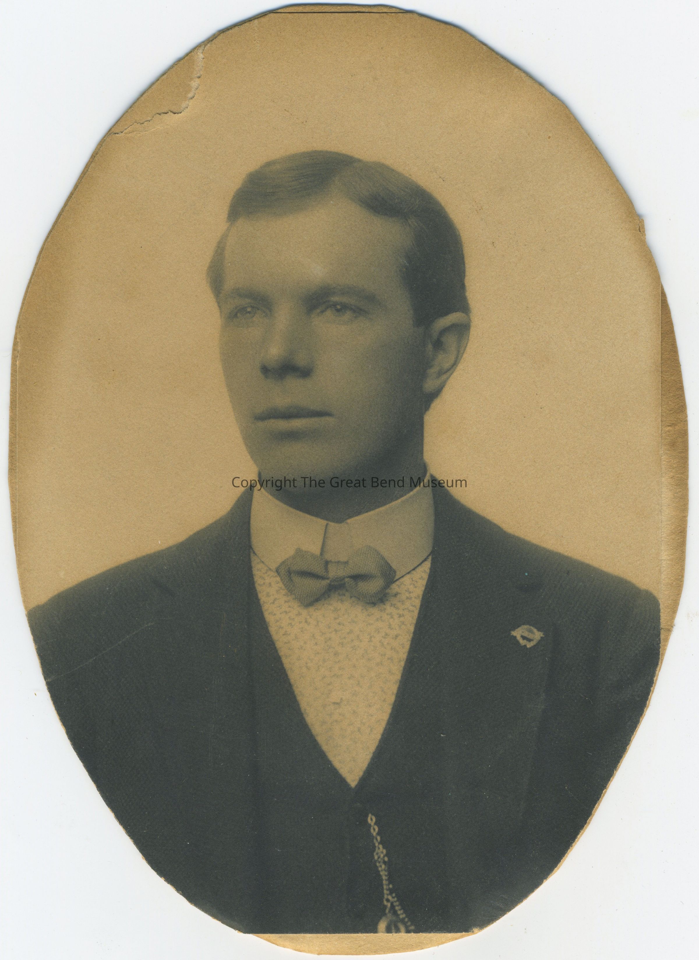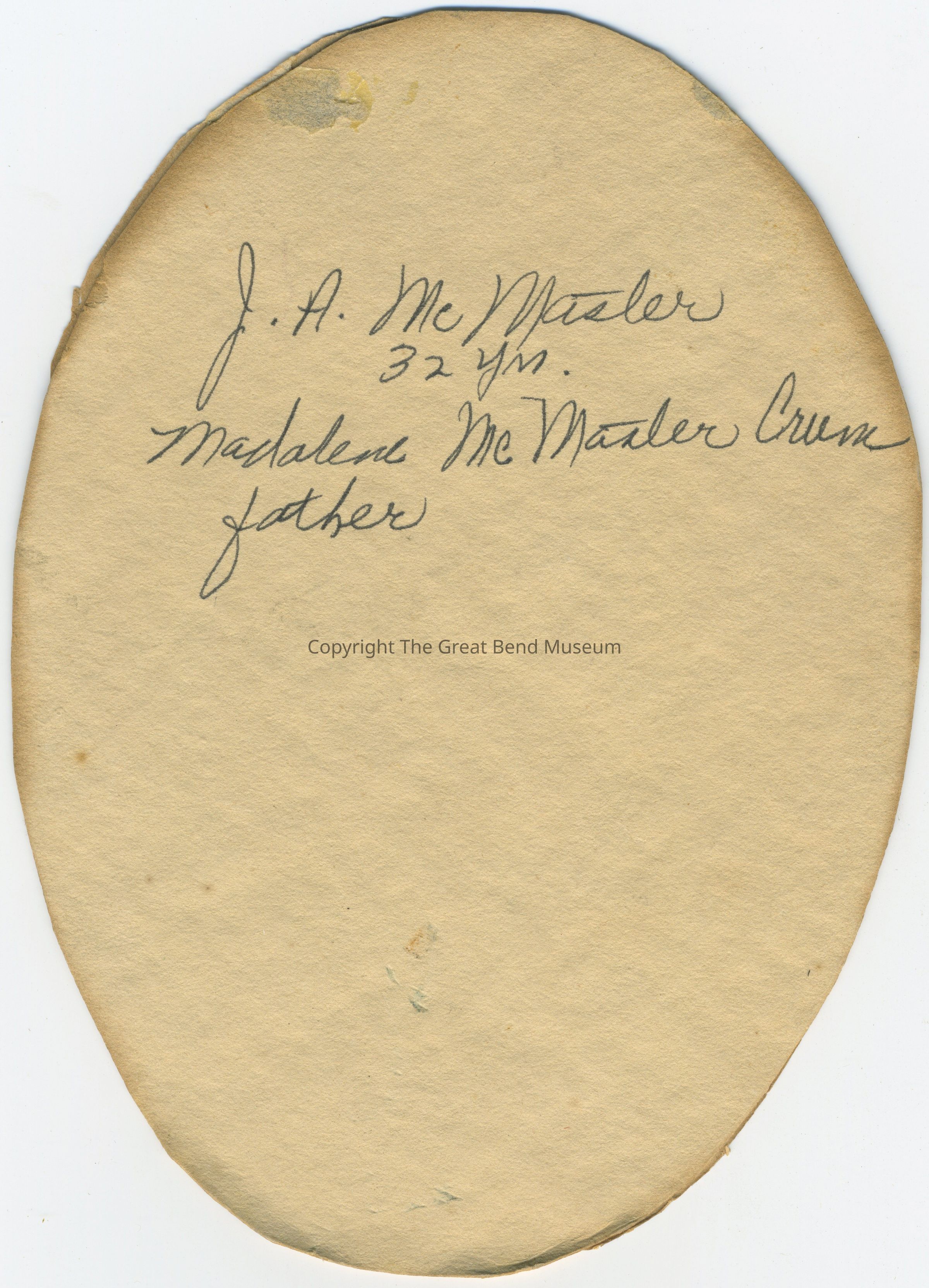 B/W photo cut oval, mounted on card stock; Gentleman in suit and stiff collar and bow tie. Watch on chain in button hole; lapel pin. Back "J. A. MMaster 32 yrs.; Madalene McMaster Crum, FatherAcquisition