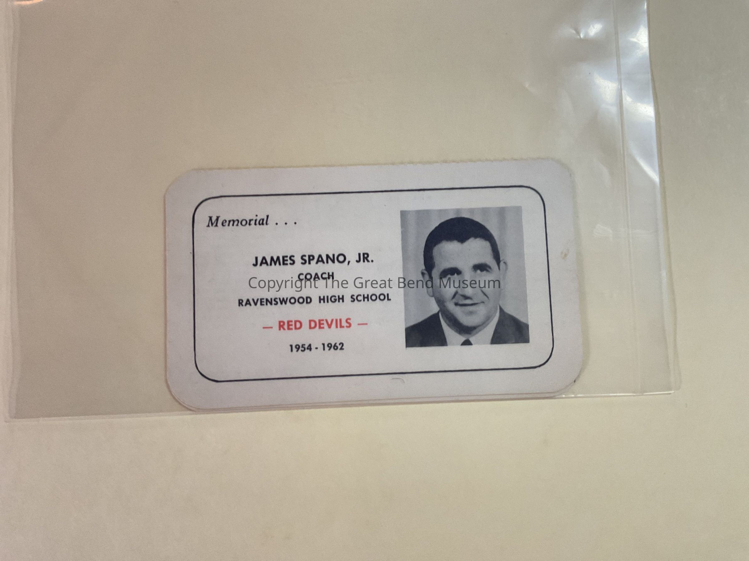 Small memorial card for James Spano Jr., coach for Ravenswood Red Devil football program from, 1954 to 1962. On the reverse, Compliments of Hartley Oil Commpany. Ravenswood WV. Also has