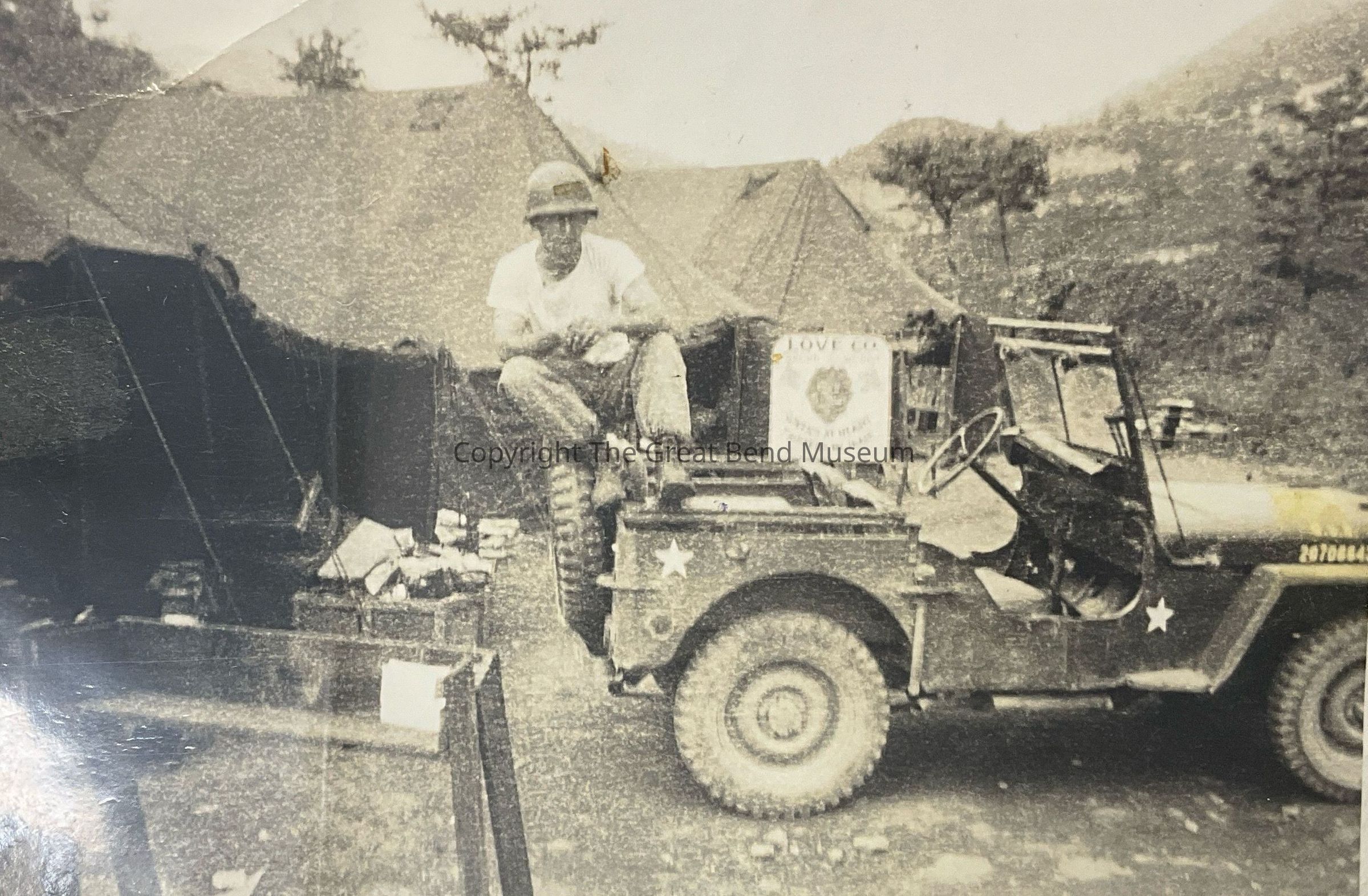 Photo of a soldier sitting on back of jeep, wearing white t-shirt and helmet. Written on the back “In front of the supply tent. Last of July 52 West of Punch Bowl Korea. Pignato”Acquisition