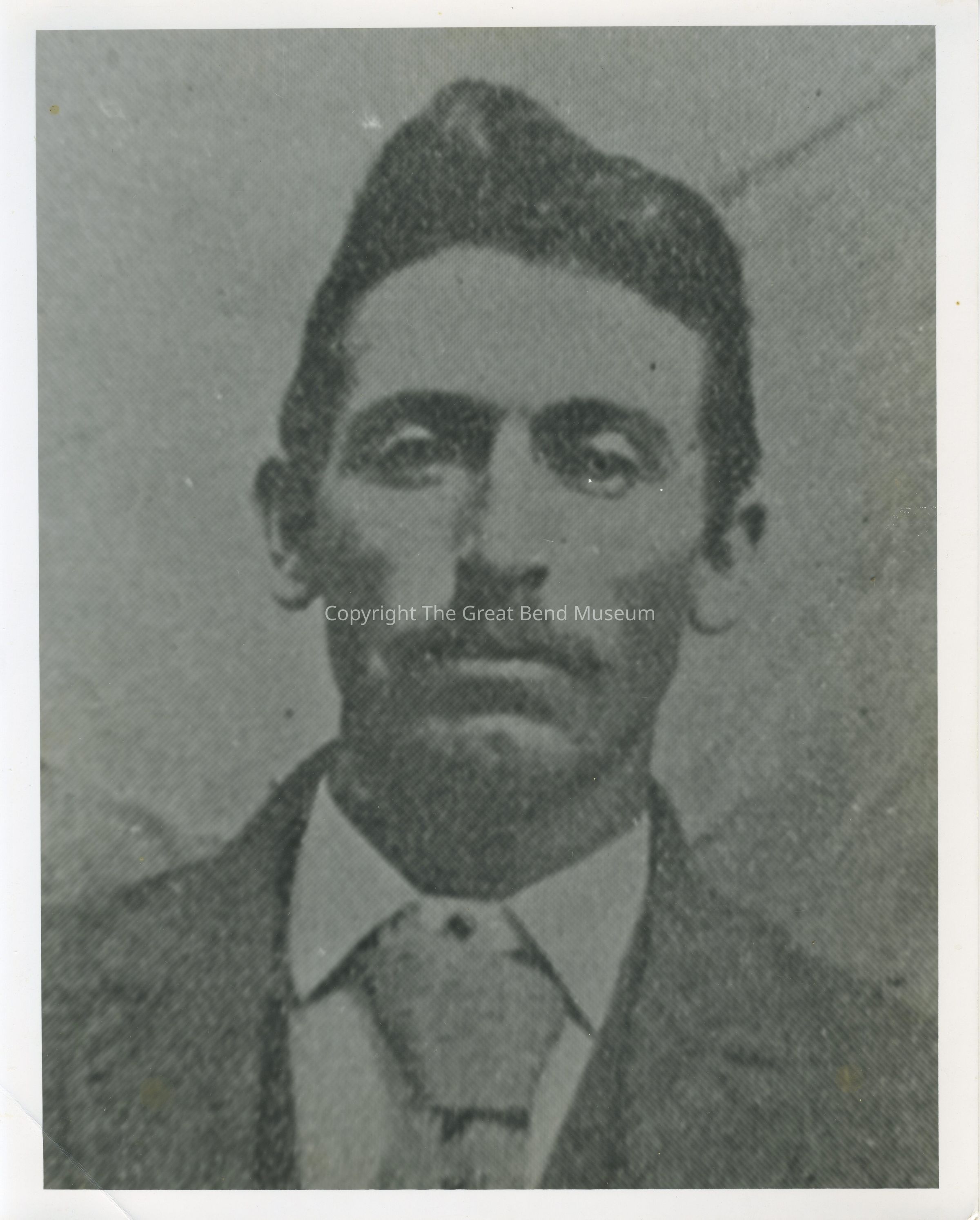 Portrait of man with dark hair and a moustache wearing a coat and tie. He is staring at the camera like it is a mug shot. It is mounted with public hanging display and it is a similar quality photo as 2020.21.01Acquisition