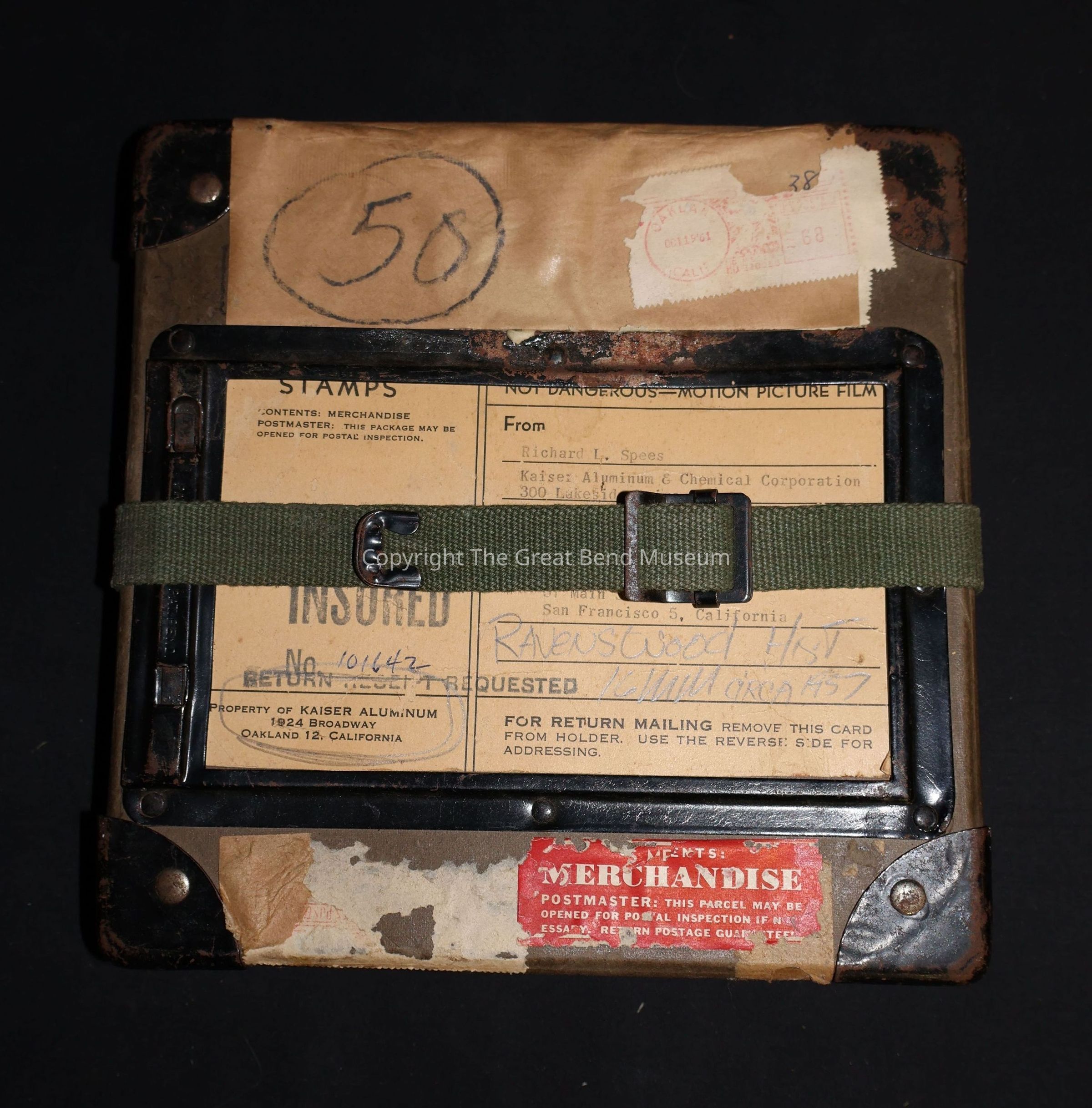 KACC 16mm Reel to Reel Film with protective case. Case exterior is 20cmx20cm square, lid & bottom box square made out of hard pressed cardboard stock with protective metal corners. Lid has affixed metal address protective, rectangular, open face compartment for mailing address card information. The mailing address card is preprinted with black lettering and lines. The address card lines has manual type writing from : Richard L. Spees Kaiser Aluminum & Chemical Corporation. 300 Lakeside Drive, Oakland 2, California To: Mr. Bart Benedict, 57 Main Street, San Francisco, California hand printed on mailing label in pencil: Ravenswood Hist. 16mm Circa 1957 a Army green color fabric strap with black metal buckle & strap wraps around case.Acquisition