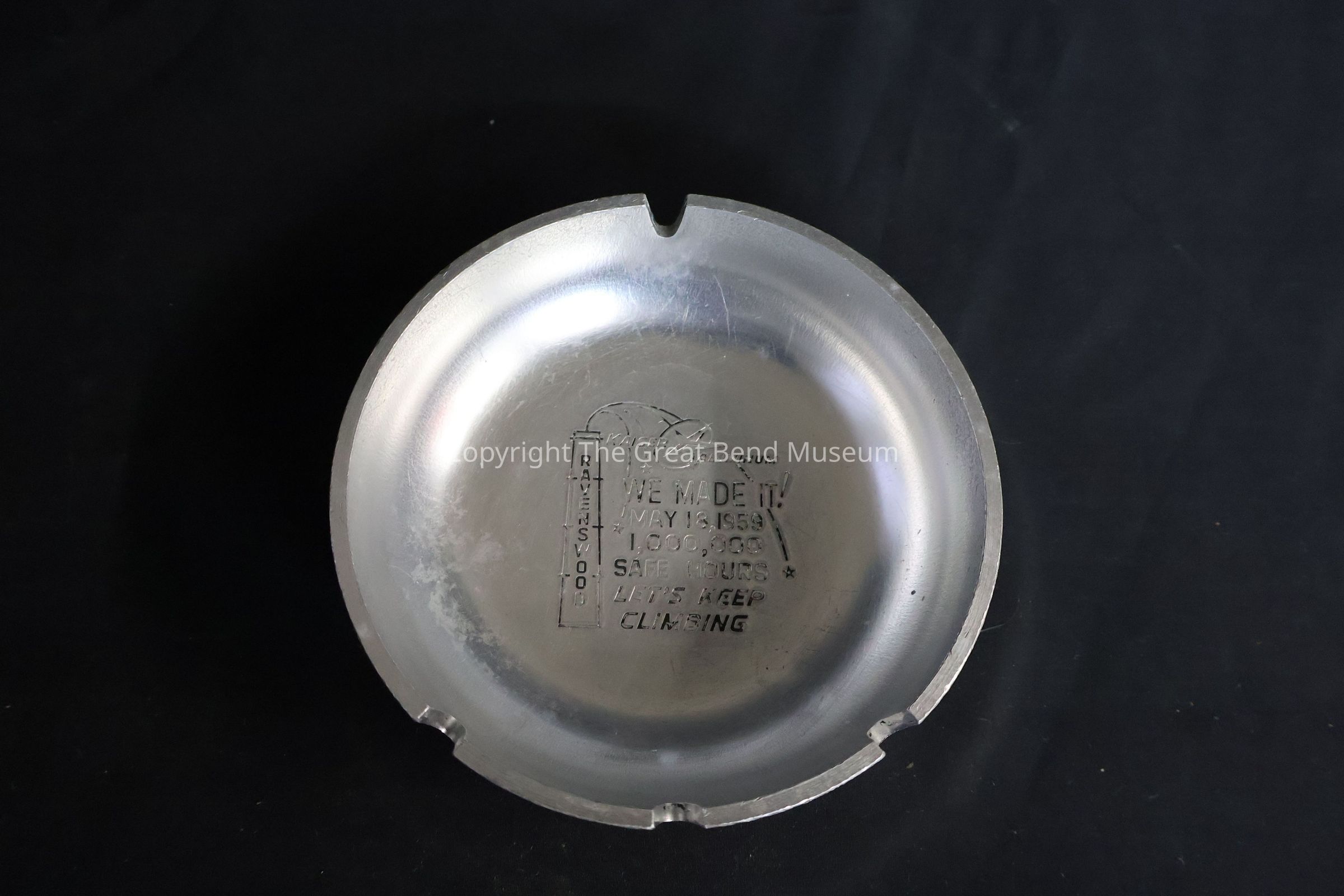 These are two aluminum ashtrays made at the KACC Ravenswood Works Plant. They are stamped with the “KACC” logo and smoke stamp. The lettering is on the bottom interior of the ashtrays and they readm “We made it! May 18th, 1959. 1, 000, 000 Safe Hours! Let's keep climbing.” One ashtray still has black ink in the stamped imprint.Acquisition