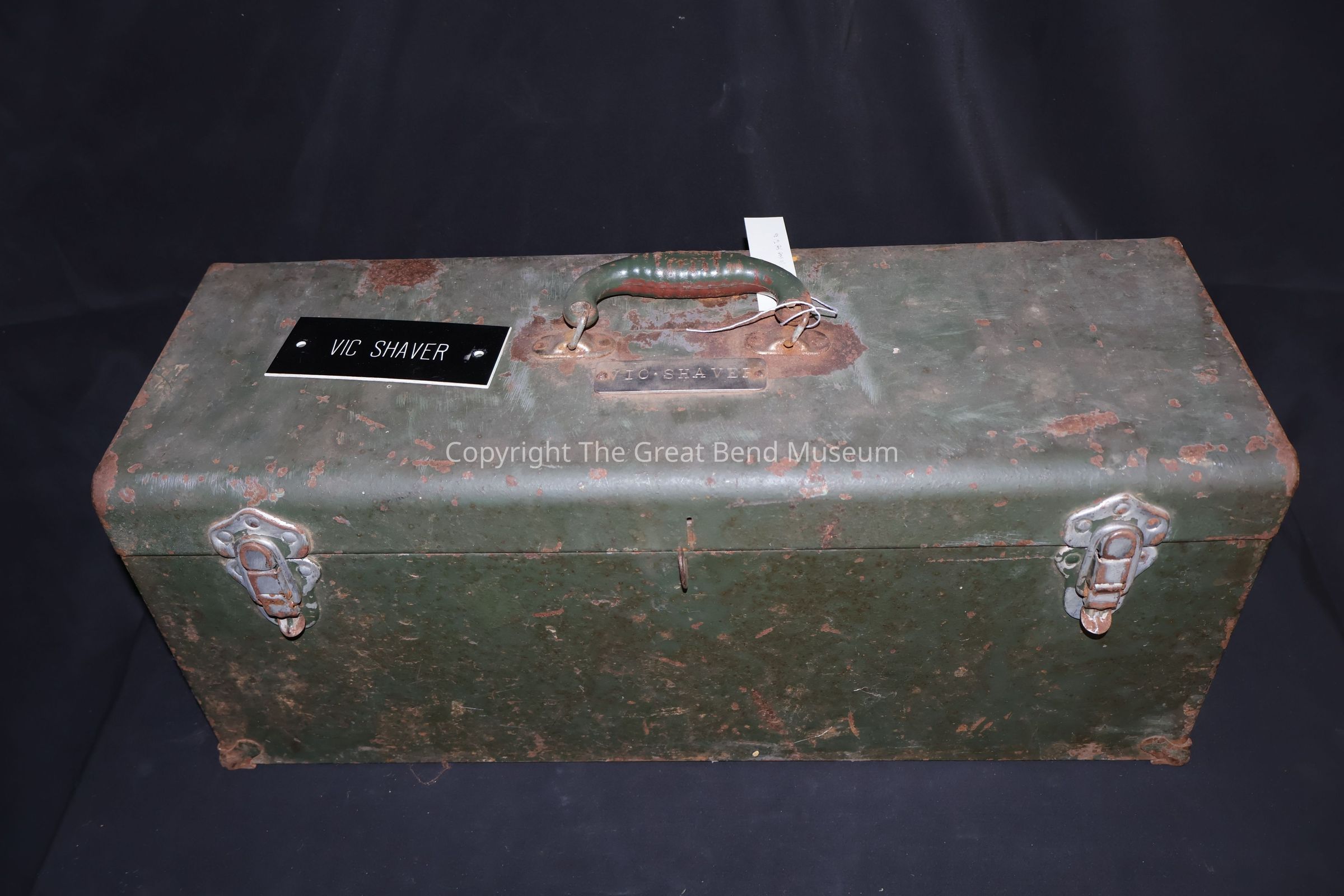 KACC Toolbox. It is a steel, rectangular toolbox. It belonged to Vic Shaver who was one of the first mainstream persons at the plant’s beginning in 1957. The color is army green, and it has a plastic handle on top with two steel latches (right and left for locking closed and open). “Vic Shaver” name plate is riveted on top of the (steel plate) lid.Acquisition