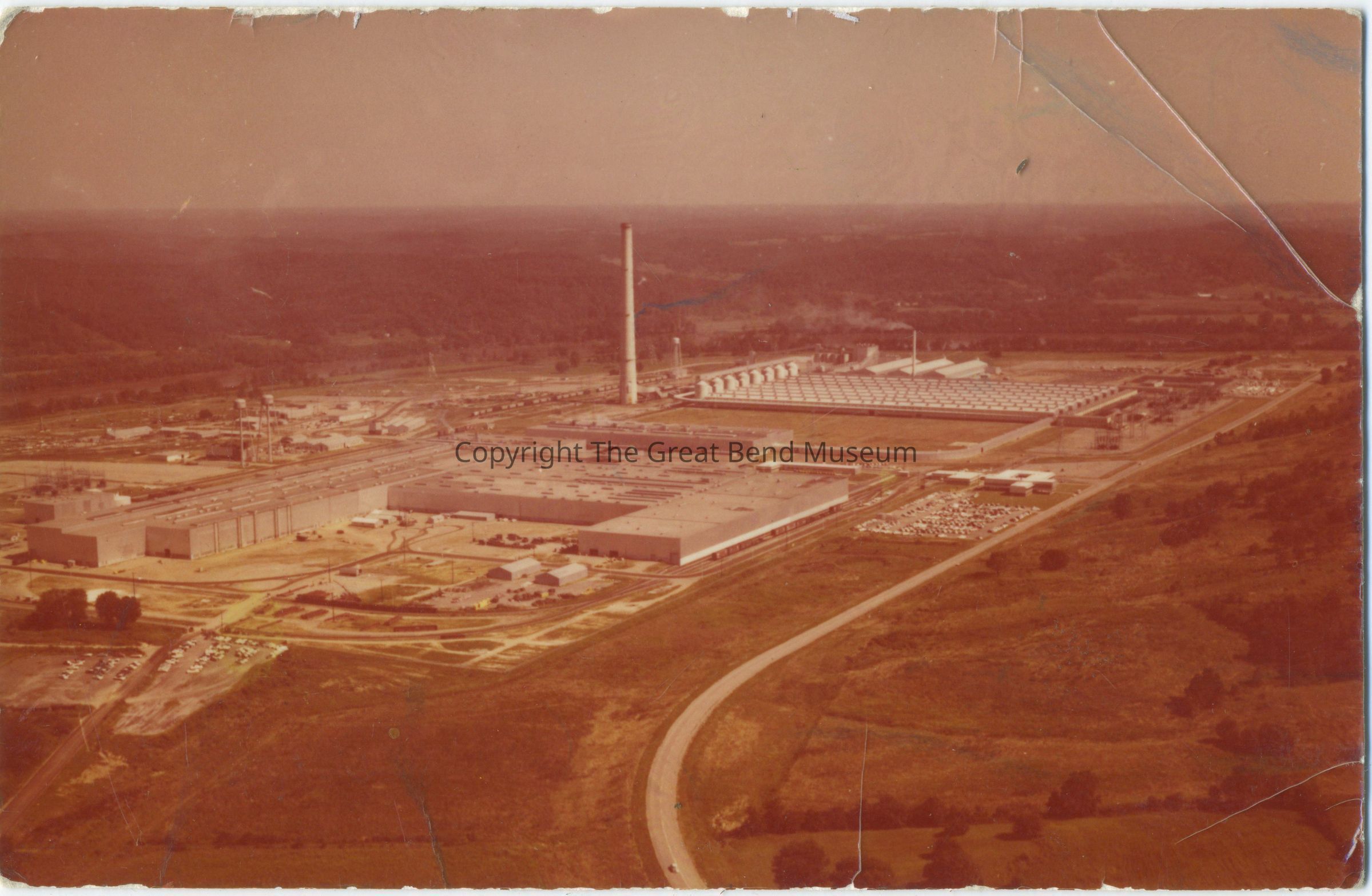 color photo - aerial view - Kaiser Aluminum Plant. Smoke stack center focus of photo. Roadway along right with buildings to left. Admin building in front, left of frame. On the back: "faint pencil looks like "27-32" "15" and squiggle."Acquisition