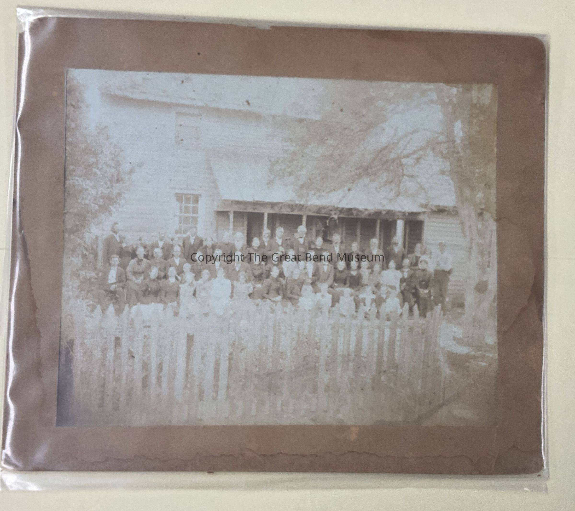 Photo of large group of people in front of Samuel and Hannah King's house. They are standing in 2nd row center. Almost 52 men, women and children, standing in 3 rows in front of a picket fence.Acquisition
