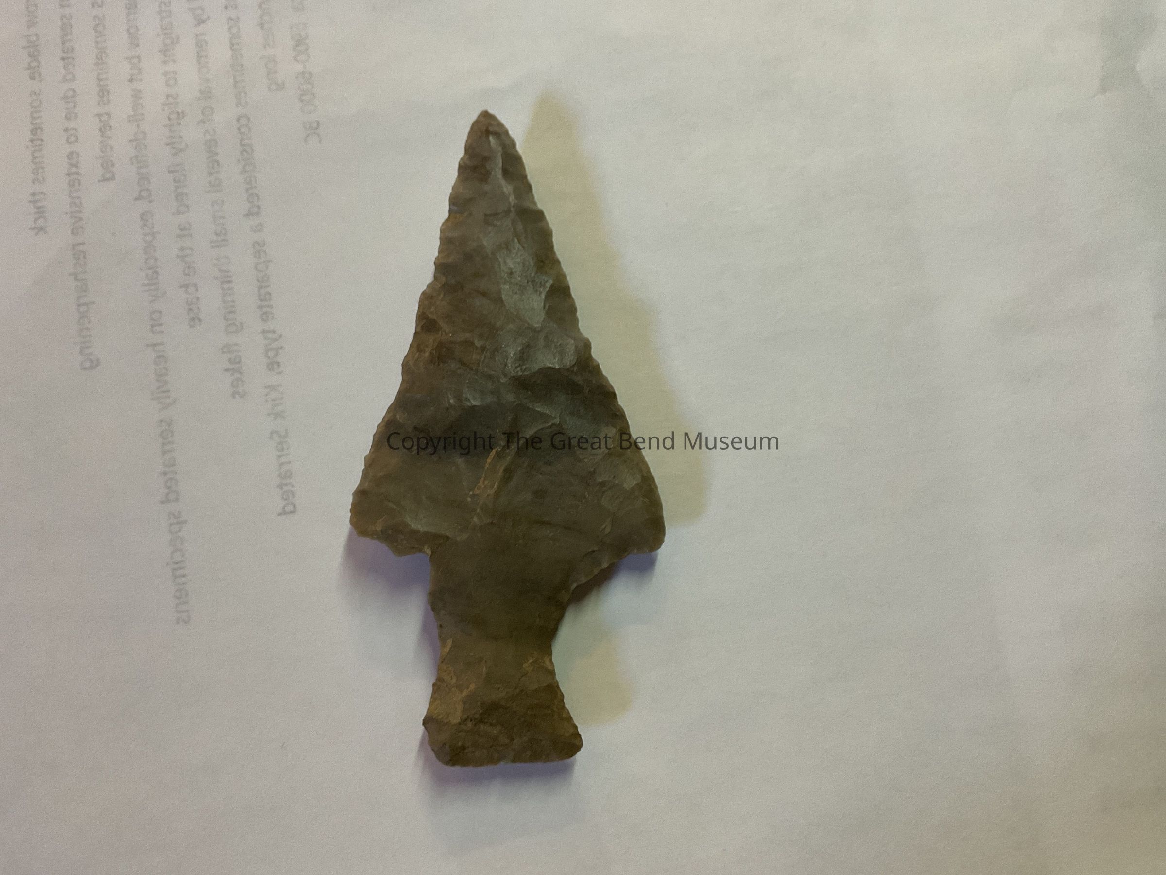 Large brownish gray point. Triangular shaped blade, with serrated edges from resharpening. Longer flared stem, with prominent shoulders, and very sharp point. Base is thinned by removing thinning flakes. Blade edges are beveled.Acquisition