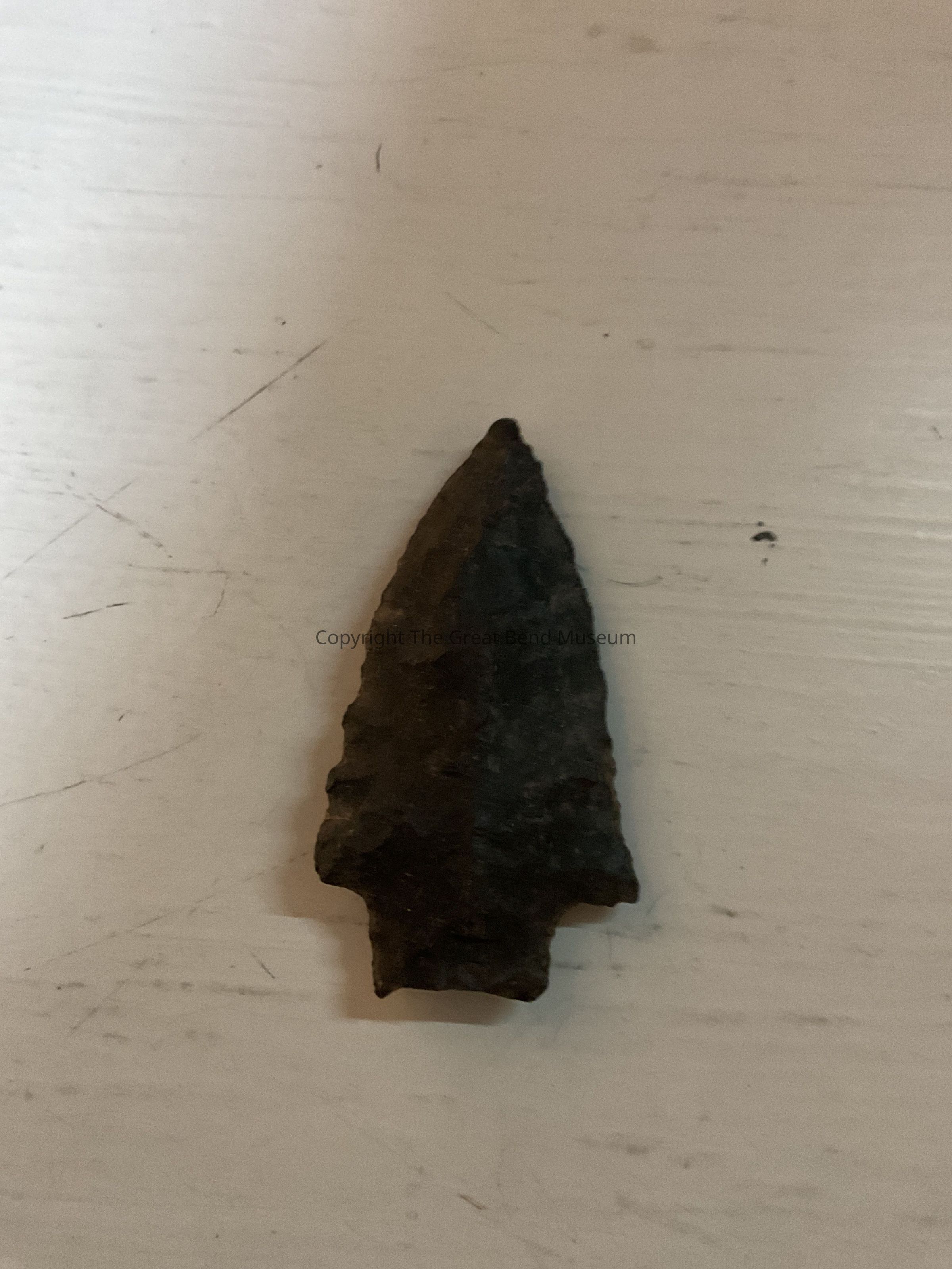 Large dark gray point. Well defined shoulders, sides are serrated from resharpening. Stem sides and bottom are straight to slightly concave. Prominent ridge in center. Where it is thickest.Made/Created