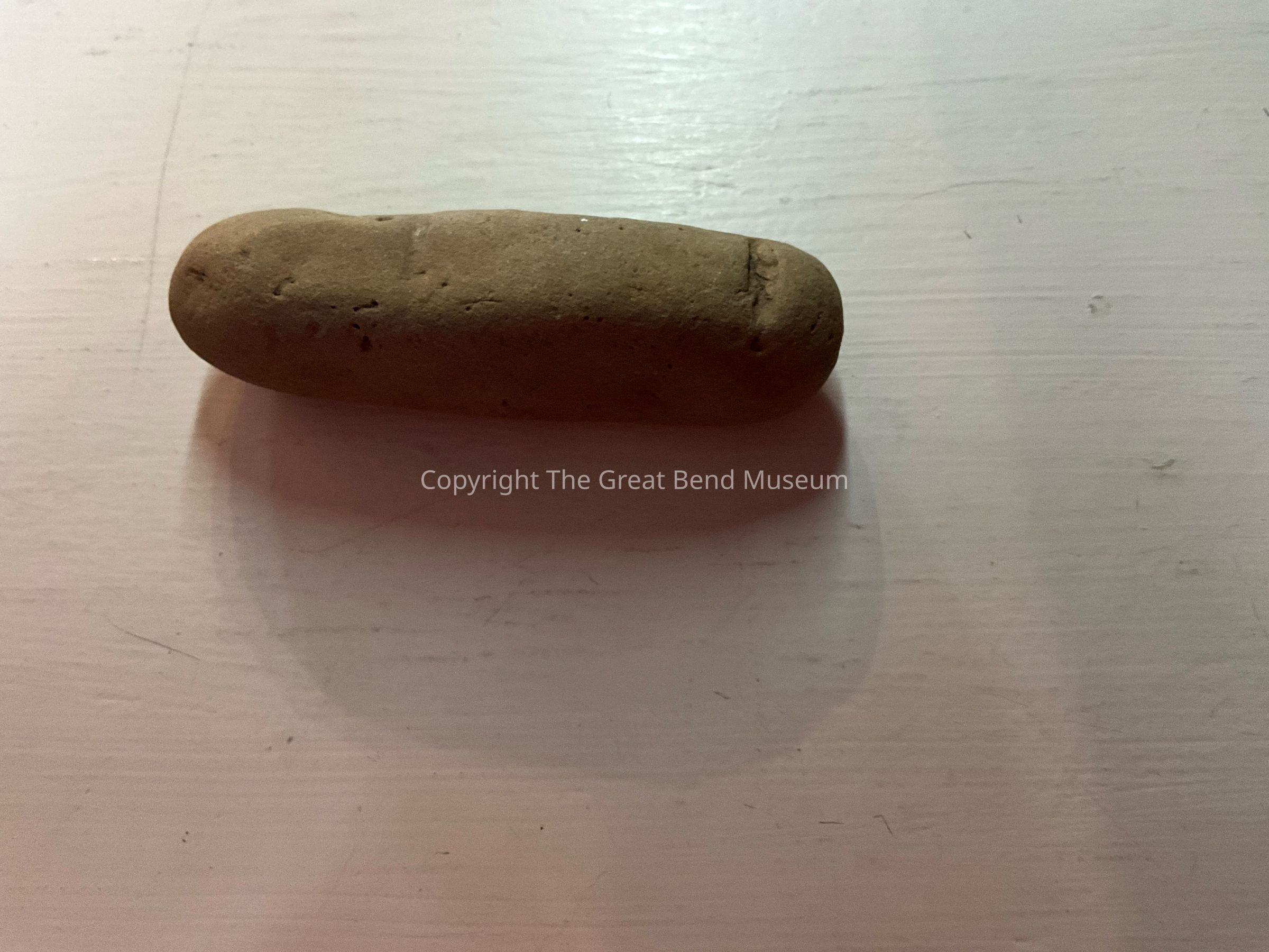 Long narrow smoothed stone. Rounded on both ends and flattened-squared in the center of the stone. Has a cut groove on one end.Acquisition