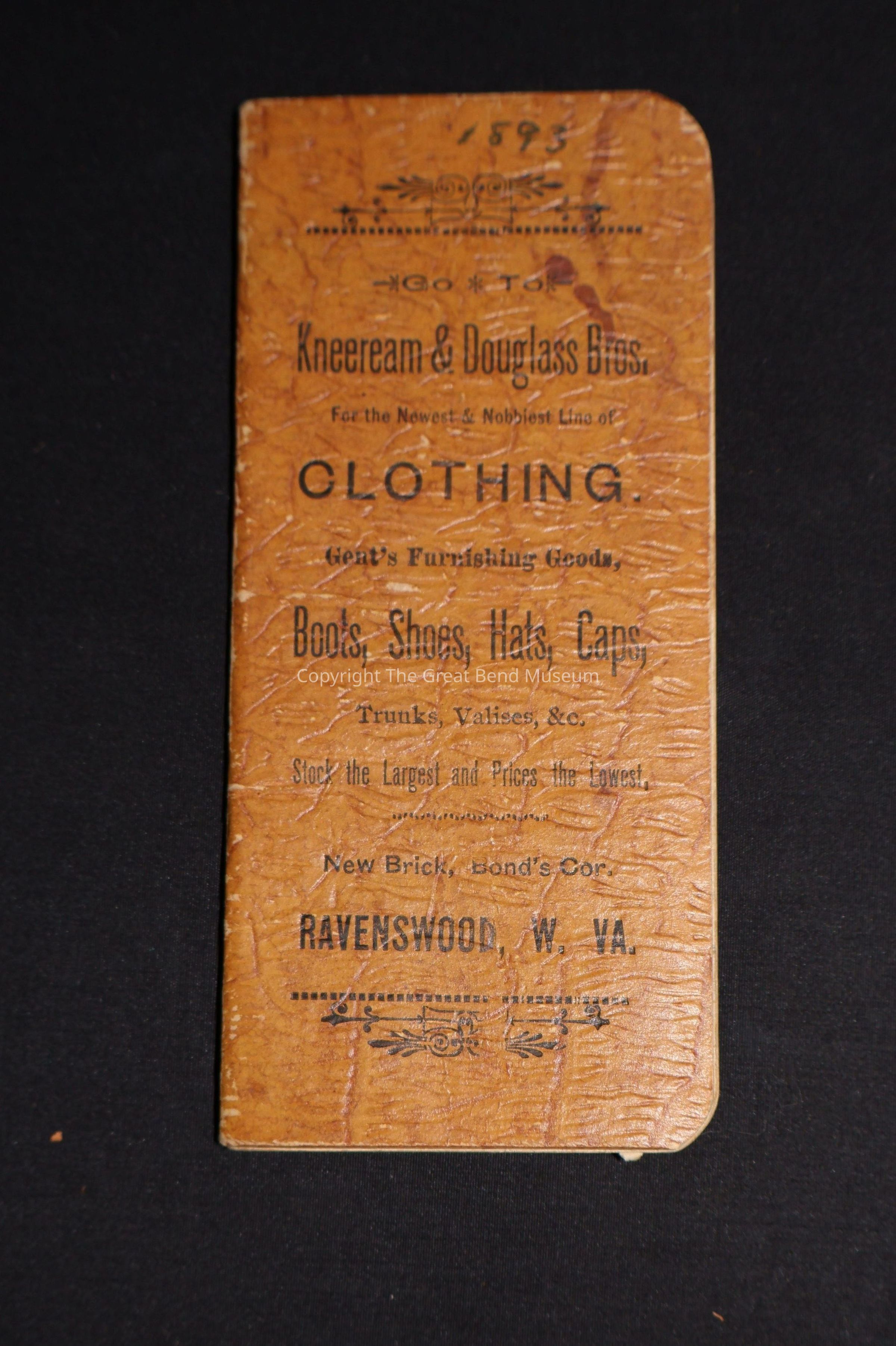 Small store ledger - light brown with "Kneeream & Douglas Bros" printed on front. Also "Clothing, boots, shoes, hats, cap, trunks, valises." Stock the largest and prices the lowest. Ravenswood WV.Acquisition