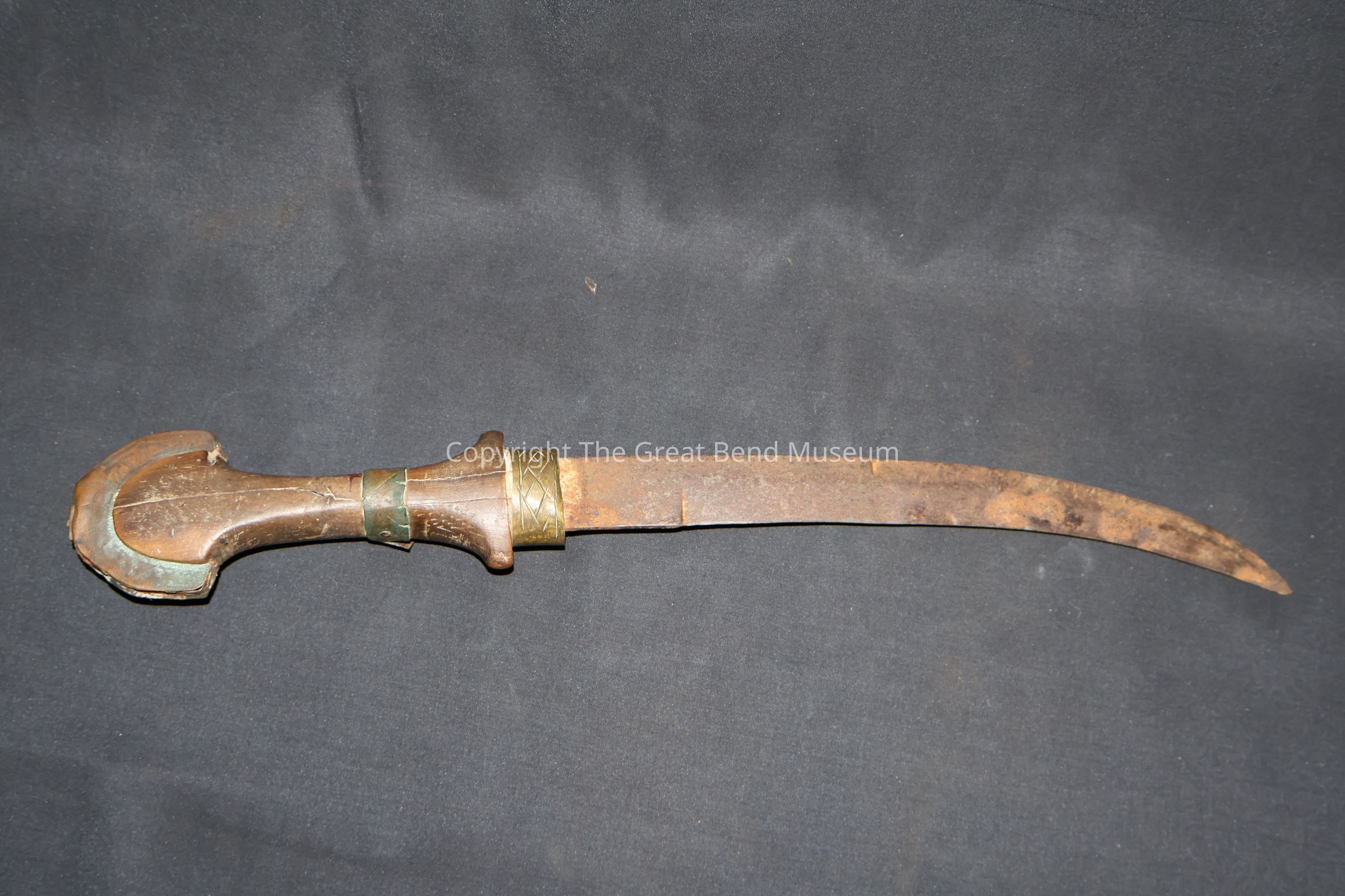 Curved dagger in the style of collier Agader Lathough no visible maker's marks. Brass or tarnished silver scabbard decorated with scrolls and foliage. The sharpened area of the blade is different on each side, shorter on cortex. Wooden or horn hilt with blunt gillions "Carms" of hilt and a brass band the fits over the mouth of the scabbard. the end of the scabbard curves around and ends with a knop (decorative final). Two rings at the mouth of the scabbard attach dagger to the beltAcquisition