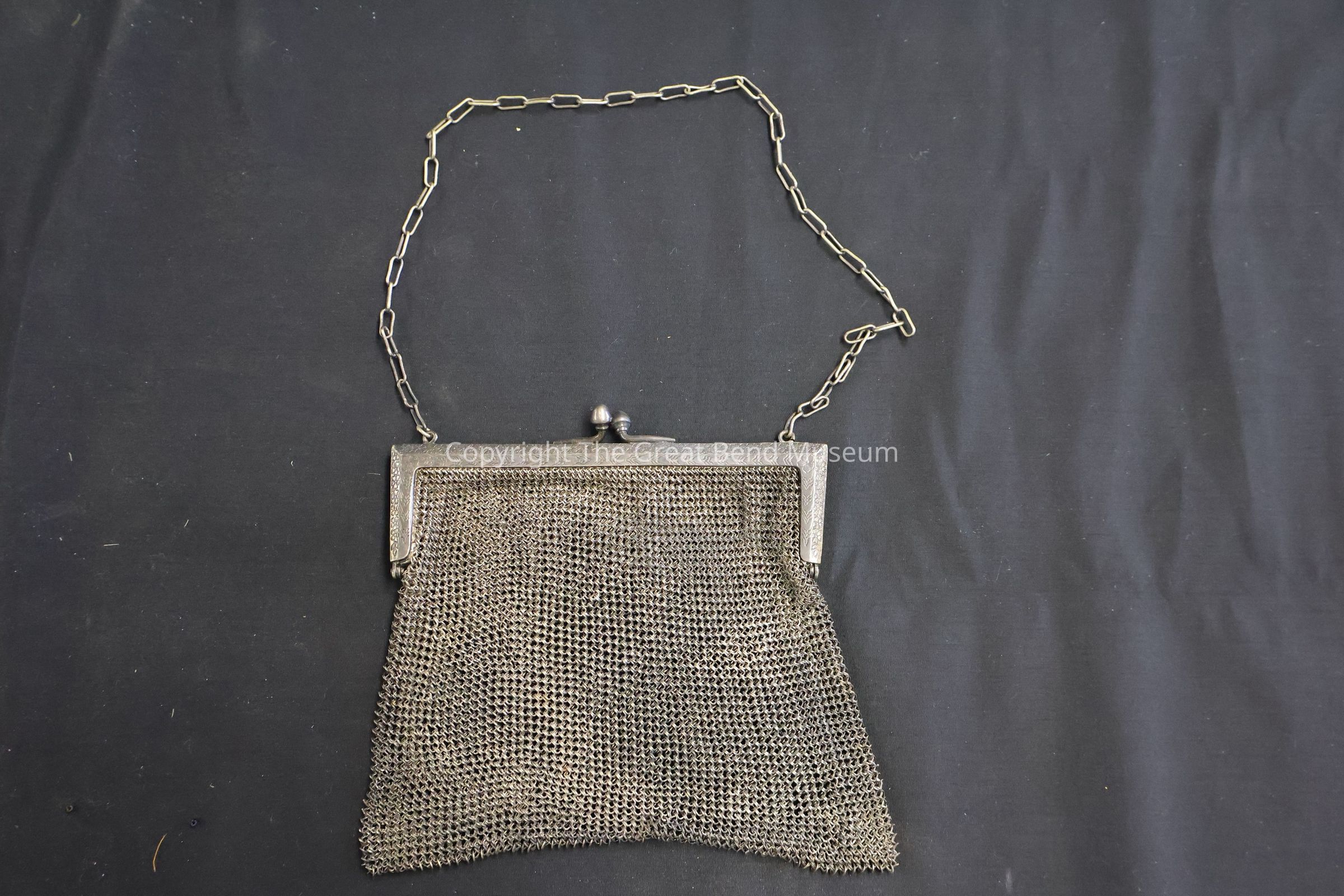 Silver mesh handbag inscribed with "Clara M. Denoon". Silver mesh with metal clasp and metal chain. Also inscribed with "Soldered Mesh"Acquisition