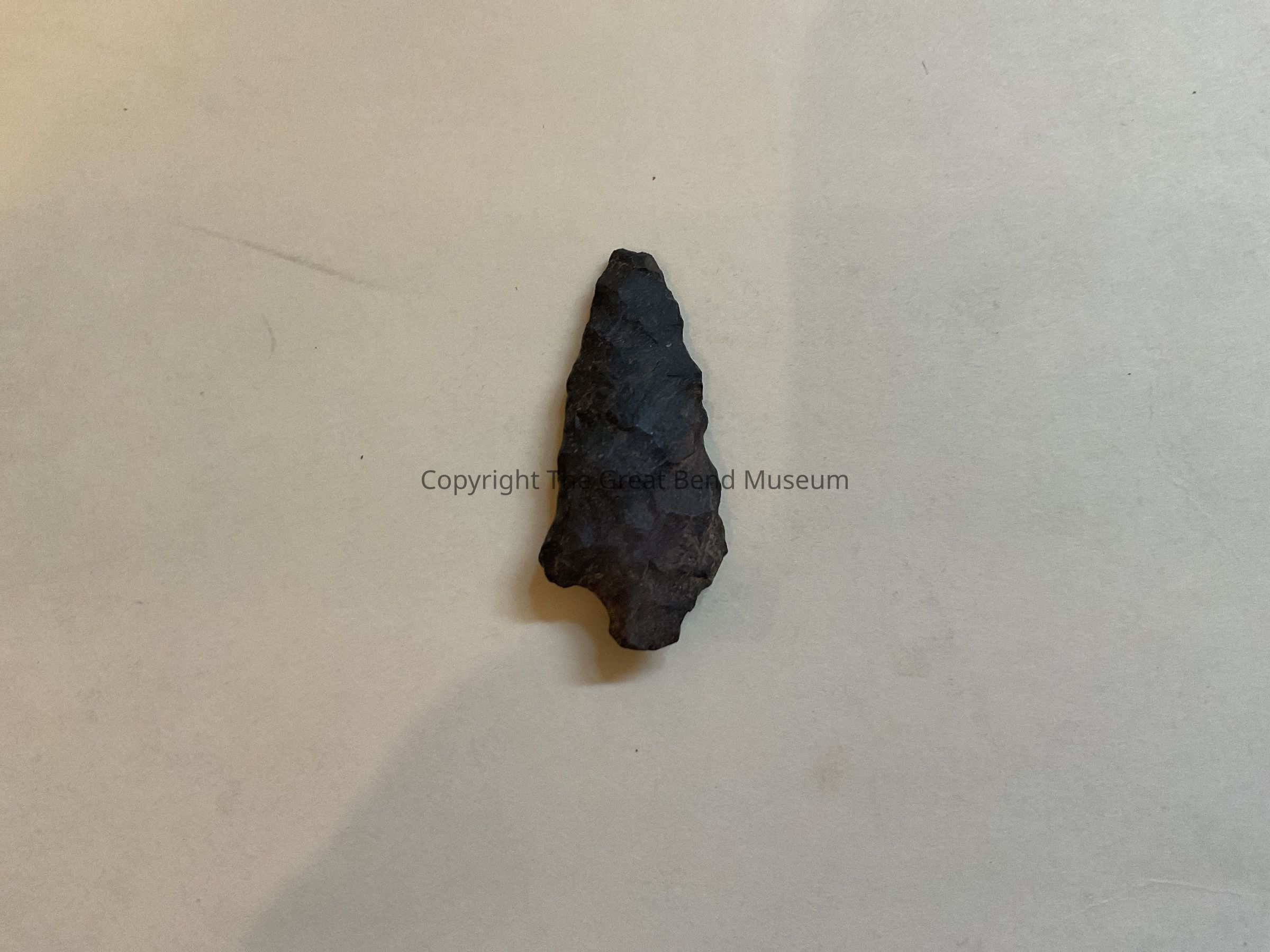 Small black point with small stem. Stem in very center only. Triangular shape with serrated edges.shoulders are asymmetrical not sure if from grinding or use.Acquisition